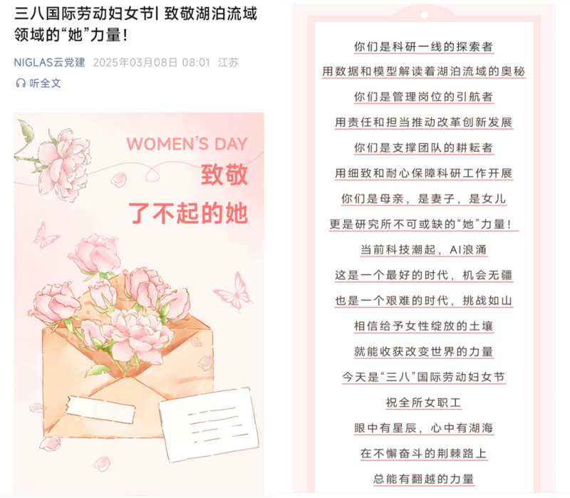 3月8日当天,发布“致敬湖泊流域领域的她力量”专题推送,为全所女职工送上诚挚的节日祝福,在不懈奋斗的荆棘路上,总能有翻越的力量,在平凡的日子里,书写属于自己的不凡篇章!