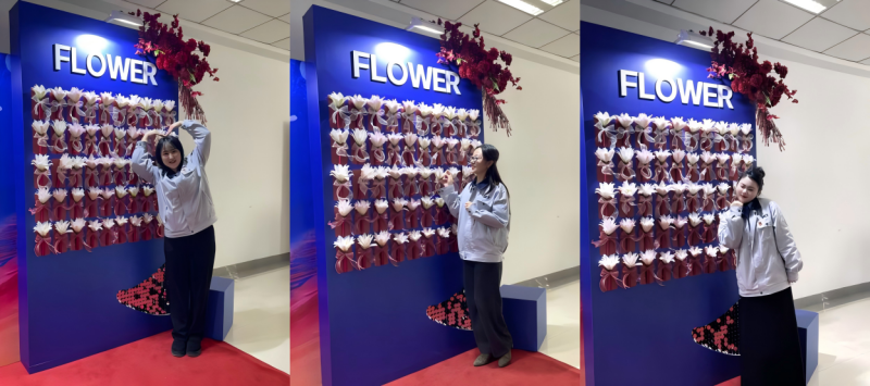 上午,女员工们在精心设置的鲜花墙前拍照打卡,定格美好瞬间,并领取象征节日祝福的鲜花。