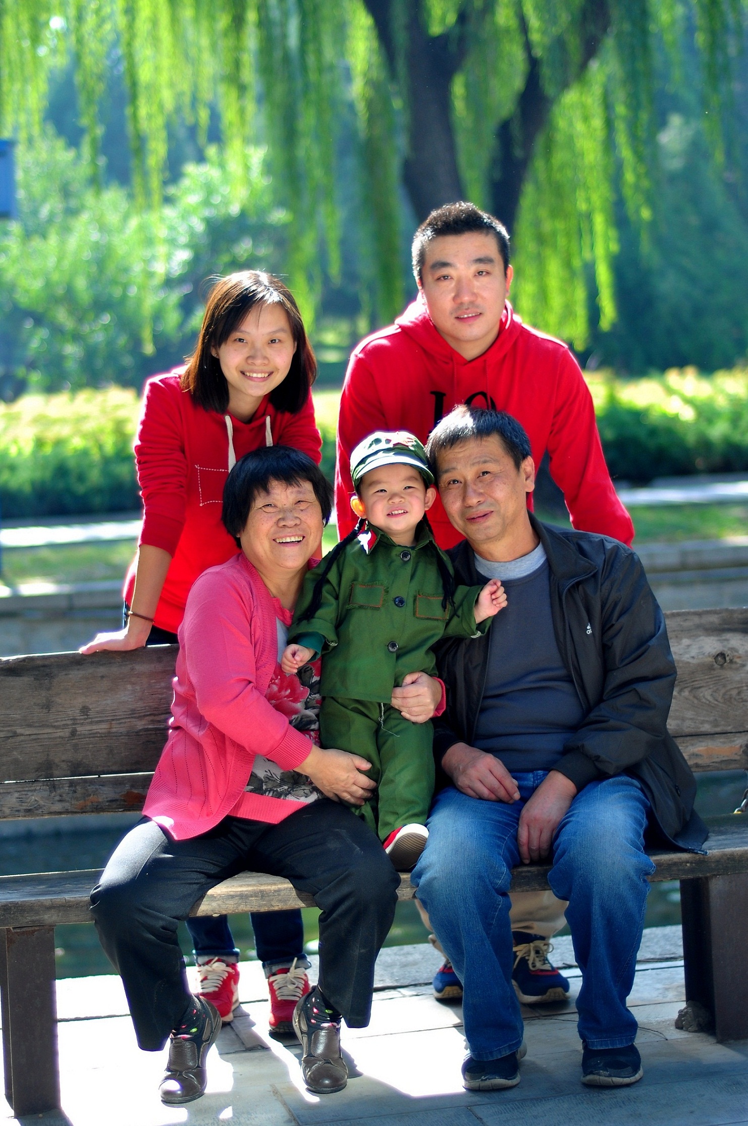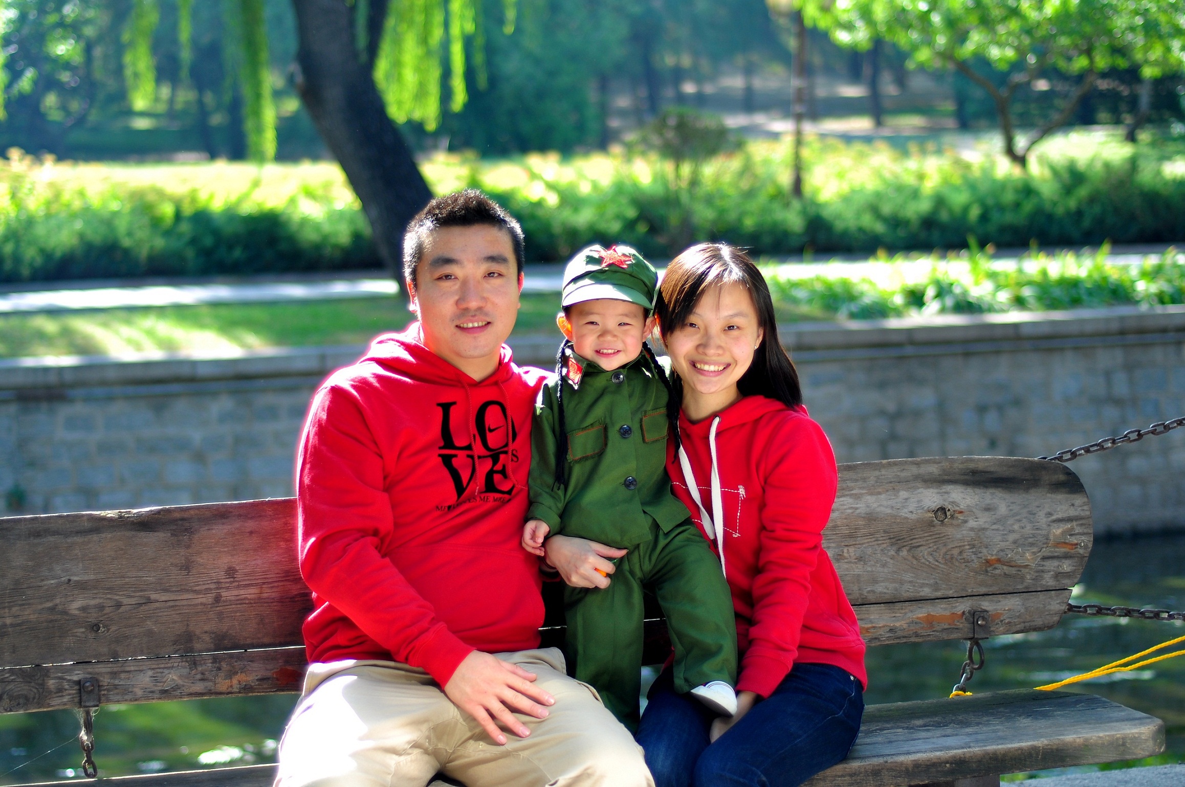 2014年,女儿满一周岁,请摄影工作室为孩子照纪念照,此照是其中一张,当时全家人一起到元大都城垣遗址公园里拍外景,春风和畅、景色旖旎,一家人换上鲜艳的春装,女儿也装上了拍摄用的小军装,用微笑迎接美好幸福的生活。
