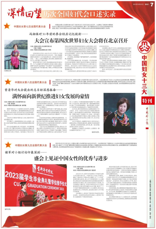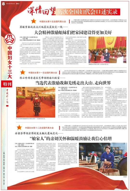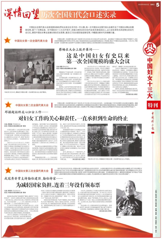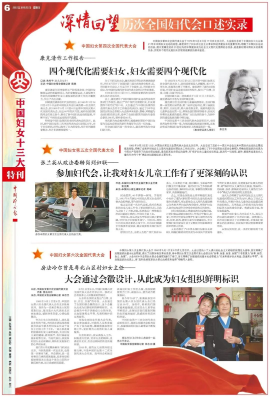 中国妇女全国代表大会是我国各族各界妇女政治生活中的一件大事,每一次中国妇女全国代表大会都开启了中国妇女事业发展新征程,留下了光辉足迹。在中国妇女十三大召开前夕,本报记者回访历次妇代会亲历者或其后人,以口述实录形式讲述难忘的妇代会记忆,展现中国妇女事业波澜壮阔的历史图景,激发亿万妇女跟党奋进新征程、巾帼建功新时代的磅礴力量。