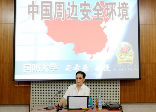 吴希来教授从我国军力提升的威慑、美国“重返亚洲”的影响、中日东海之争的风波、东北亚的“朝核危机”、南海海洋权益的交量、民族分裂与恐怖主义的阴影等六个方面全方位介绍了我国目前面临的安全形势,使大家清晰地了解到我国国防科技发展现状、近期热点事件背后的原因以及中国崛起面临的挑战。吴希来教授的报告生动活泼,引人入胜,充满正能量,得到听众的高度评价。