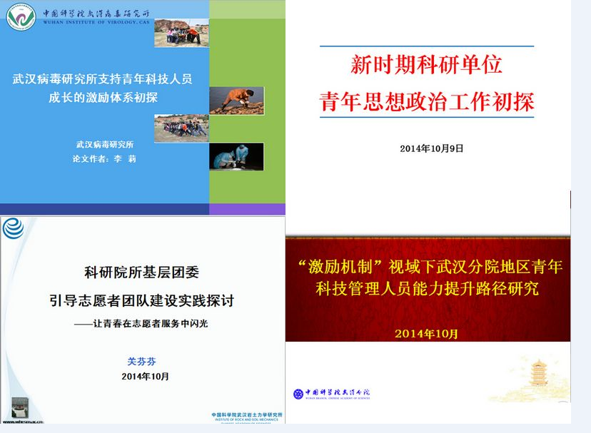 近期,在武汉分院召开的2014年度“两研会”年会上,各单位共有青年成长成才方面的5篇论文提交大会进行交流,在评选出的11篇优秀论文中,参加大会交流的4篇论文全部获奖,理论研讨成果受各单位领导好评。武汉分院徐伟的《“激励机制”视域下武汉分院地区青年科技管理人员能力提升路径研究》获得一等奖,武汉病毒研究所团委书记李莉的《支持青年科技人员成长的激励体系初探》获得二等奖,武汉岩土所团委书记关芬芬撰写的《科研院所基层团委引导志愿者团队建设实践探讨——让青春在志愿者服务中闪光》和武汉文献情报中心裴攀撰写的《新时期科研单位青年思想政治工作初探》获得三等奖。武汉物理与数学研究所团委书记王亮伟的《关于科研单位共青团组织在围绕“创新2020”充分发挥青年作用服务青年的方式途径研究》参加了书面交流。(武汉分院团委)
