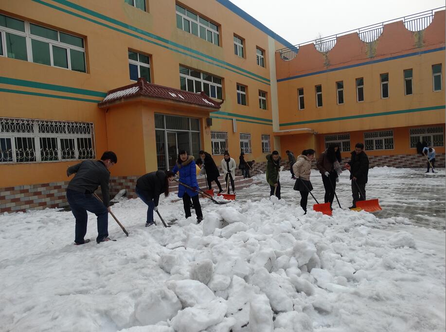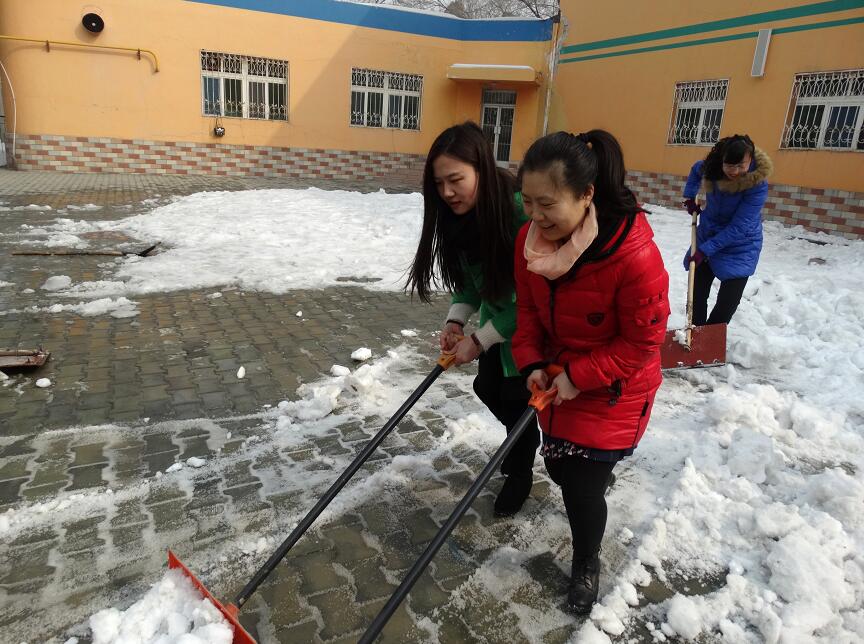 虽然冰雪覆盖较厚且底层已结成结实的冰层,清理过程比较费时费力,但志愿者分工明确,手持铁锨的志愿者负责铲冰、手持推雪板的志愿者负责推雪,整个劳动场面热火朝天,不一会儿大家已是满头大汗。幼儿园的青年教师看到志愿者们奋力的铲冰推雪,也自觉加入到劳动队伍。俗话说,人多力量大,经过两个多小时的辛勤劳动,园区被彻底打扫干净。虽然大家很累,但能为孩子们做一点点事情,每个人心里还是暖暖的。更让我们感动的是,清雪结束后,幼儿园园长还为大家准备了水果和茶水,让我们品尝幼儿园食堂师傅为孩子们制作的糕点,共同探讨幼儿教育的话题。