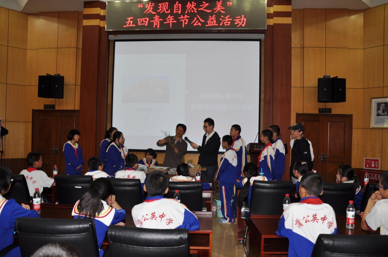 为庆祝五四青年节的到来,4月23日,植物所团委举办了主题为“发现自然之美”的五四青年节公益活动。活动组织了来自农民工子弟学校蒲公英中学的初一年级学生到植物所参观学习。所团委、所青年志愿者协会志愿者、公益社团组织“寻找alpha”社团和北师大经管学院的志愿者约70人参加了活动。