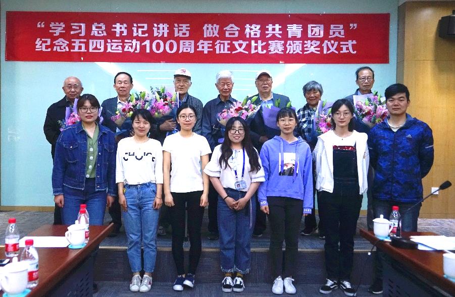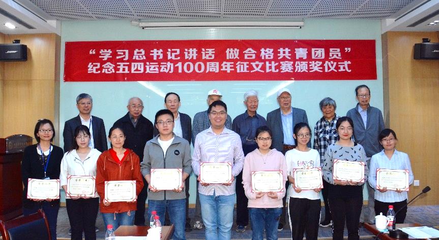 李蕴能宣读了“学习总书记讲话 做合格共青团员”纪念五四运动100周年征文比赛获奖名单,老科学家们为获奖青年一一颁奖并合影留念。青年学子代表向老科学家们献上鲜花,鞠躬致敬,对老科学家们对青年成长成才的关怀表达了最诚挚的感谢和深深的敬意。