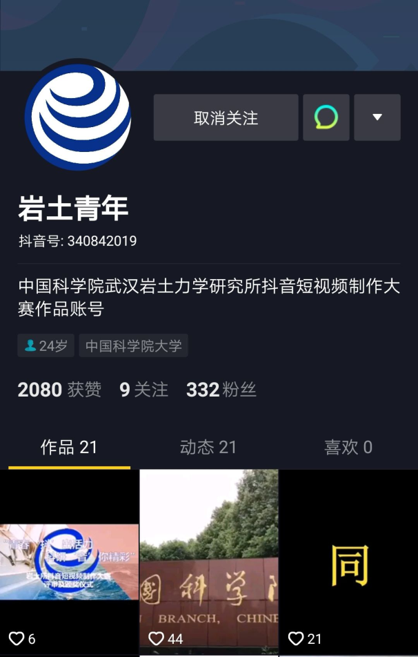 此次活动时值新中国成立70周年、中国科学院建院70周年,有效利用了当前流行的新媒体平台,上传的作品积极阳光,特色鲜明,用独特的方式展现了科苑生活的魅力,激发了岩土所学子们的创造力和表现力,展现了新时代新青年的新风貌,也增强了学生们的爱国、爱院、爱所情怀。(“岩土青年”抖音号已经推送了本次活动的全部精彩视频)