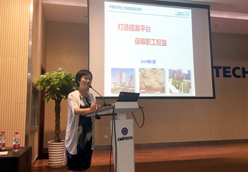 上海分院工会副主席、上海硅酸盐所工会主席孙伟嬿给大家带来《打造提案平台,保障职工权益》的主题报告。孙伟嬿首先解释了“提案”的基本涵义,介绍了不合格提案的评审标准,并从提案内容规范、提案质量提高、提案执行反馈机制完善等方面,回顾了上海硅酸盐所提案发展的过程。她认为,硅酸盐研究所《职工代表大会提案征集和处理办法》出台之后,虽然提案数量有所下降,但质量明显大幅提高,有效推动了研究所的改革发展。孙伟嬿还和与会人员分享了优秀提案范例,介绍了硅酸盐所提案公开机制和三年“回头看”活动,分享了怎样写好提案的心得。