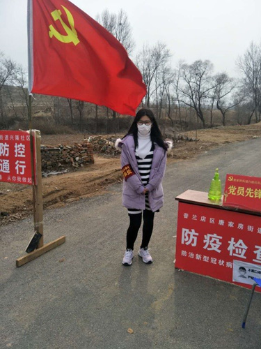 疫情期间,村里的防控小组每天电话监测体温,并给每家每户送消毒水、口罩等物品,家乡政府和村委防疫小组的这些暖心举动,触动着这个“90后”的心。隔离期满,作为党员的佟金凤毅然加入抗疫志愿服务,在村政府的“禁村”呼吁下,加入了村里轮流值守的志愿者岗。在党员先锋岗卡口主动站岗,禁止外来人员进村,她希望能为家乡父老做一点力所能及的事情,为这场疫情的胜利贡献自己的一份力量。