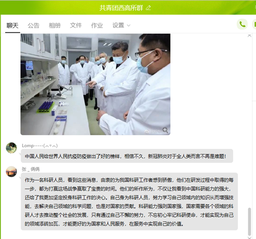 西北高原生物研究所研究生舒锴: 没有人能够预料到17年前笼罩在我国上空的阴霾会在17年之后以一种更为惨烈的形式再度席卷神州大地。这无疑是对十四亿中华儿女的严峻挑战。然而饱经磨难的中国人民从来不会畏惧任何一种挑战。党中央果断决策,积极响应,为应对疫情迅速做了各级响应。习近平总书记亲自部署了应对疫情的各项举措,为打赢这场疫情的总体战,阻击战指明了方向。3月2日下午,习近平先后来到军事医学研究院、清华大学医学院,考察新冠肺炎疫情科研攻关和诊疗救治工作,了解疫苗、抗体、药品、快检产品等研究和应用进展情况,看望慰问专家和科研人员,并主持召开座谈会,听取有关部门负责同志和科研人员的意见和建议。首先,作为直属于我国最高学术咨询机构高校的一名研究生,我感到非常自豪。因为科学技术是第一生产力,同时在这场疫情中也是一线医护人员手中杀向病魔要害的利刃!其次,因为自身所学专业的缘故,不能为疫情的科研攻关做出强有力的贡献,在此只能向奋战在一线科研攻关的同仁们致以崇高的敬意。同时。我也看到了自己身上的责任和重担,并下定决心要学好自己的专业,争取在自己的领域内为祖国贡献自己的力量,将祖国建设得和谐美丽。第三,作为一名共青团员,是党的助手和后备军。在新时代我们要努力提升自己的思想高度和工作能力。尤其作为国科大的学生,更要在思想和业务水平上达到双高!不辜负国家的培养以及党和人民的信任。不忘初心,砥砺奋进,争取为祖国发展贡献自己的一份力量!
