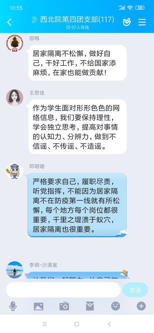 西北生态环境资源研究院第四团支部:2020年的这个冬天并不寻常,武汉、湖北、全国人民都遭受着疫情带来的悲伤、离别、焦虑。作为一名研究生,我们也在持续关注着疫情的发展,也无时无刻不被奋战在一线的防疫工作者、“火神山”建设者、“硬核”村干部感动着,也因为看到多个国家的支援物资而眼含热泪,相信只要我们团结一心、众志成城,我们一定会战胜这次疫情。疫情就是命令,防控就是责任。疫情自发生以来,习近平总书记高度重视,做出一系列重要指示,对疫情防控工作进行研究部署,提出明确要求。在这场没有硝烟的战场上,一名名共产党员挺身而出,广大党员干部发挥了先锋模范作用,他们自行接力,不忘初心、挺身而出,牢记人民利益高于一切,切实担负起战疫情的职责,他们全力以赴、尽锐出战,始终和群众并肩作战,带头奉献,积极投身防控疫情第一线。在疫情面前,我们没有一个人能置身事外,对于广大人民群众能做的就是“宅”在家,这是对自己负责,对他人负责,更是对社会、对国家最大的支持。作为我们学生来说,首先坚信在国家和党的正确指导下,可以战胜病毒。其次从自身做起,做好自我防护,积极进行自我排查,配合学校,社区的电话询问,当面对形形色色的网络信息,我们要保持理性,学会独立思考,提高对事情的认知力、分辨力,学习有关的防控知识,锻炼身体,提高身体素质,做到不恐惶、不信谣、不传谣、不造谣。疫情还未结束,医护人员依然坚守在防控岗位,听党指挥,严格要求自己,不聚会,少外出,勤洗手,戴口罩,履职尽责,不能因为居家隔离不在防疫第一线就有所松懈,每个地方每个岗位都很重要,千里之堤溃于蚁穴,居家隔离也很重要。相信祖国,相信党,胜利的曙光已经在路上。苟利国家生死以,岂因祸福避趋之,磨难压不垮、奋起正当时。在举国上下万众一心、众志成城做好新冠肺炎疫情防控工作的特殊时刻,我们坚持居家隔离不松懈,在大战中坚定信心、不负韶华,我们更坚信这场防疫攻坚战的成功指日可待,珞珈樱盛,华夏同心。