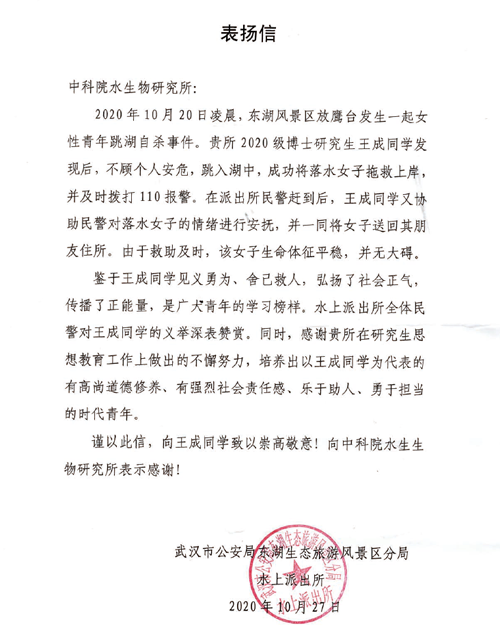10月28日,武汉市公安局东湖生态旅游风景区分局水上派出所赵所长一行到中国科学院水生生物研究所送表扬信,表扬水生所2020级博士研究生王成(导师:何舜平)同学见义勇为,弘扬社会正气,并表达崇高的敬意和诚挚的谢意。至此,8天前王成同学英勇救人的一幕才得以公开。