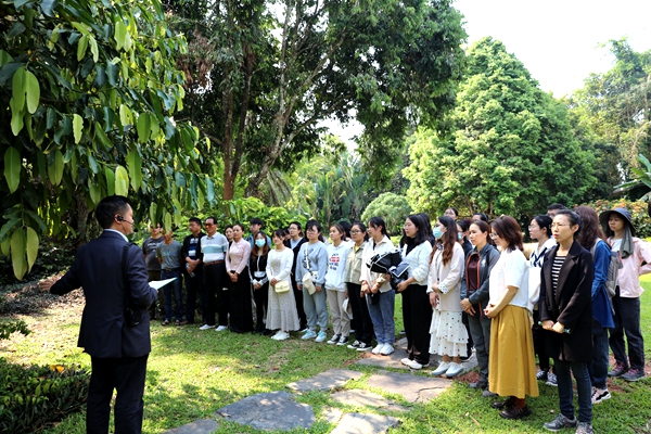 园团委特别邀请退休职工李彦昌、帅建国两位老同志与青年朋友们一起回顾建园历程。李彦昌、帅建国带领青年们走进了建园初期最早建立的一批专类园区,如原棕榈区、药用区、标本区、竹区等,讲述版纳植物园在蔡希陶等先辈带领下在曲折中不断前进的发展历史,追忆建园峥嵘岁月。