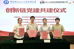 为构建“党建+创新”协同机制,现场举行“创新链党建”共建仪式,医学所核酸分子医学党支部、诊断与组学党支部、药物与器械党支部与省国贸集团浙药第一党支部共同签约“党建构建生物医药产业高质量发展新机制党建共建行动”,让党组织成为链接科研资源与产业需求的“桥梁”;同时活动现场举行“浙青年·合创行动”共建仪式,医学所团委书记与省国贸集团团委书记共同交换水晶杯,进一步集聚双方青年智慧,推动合力建功。