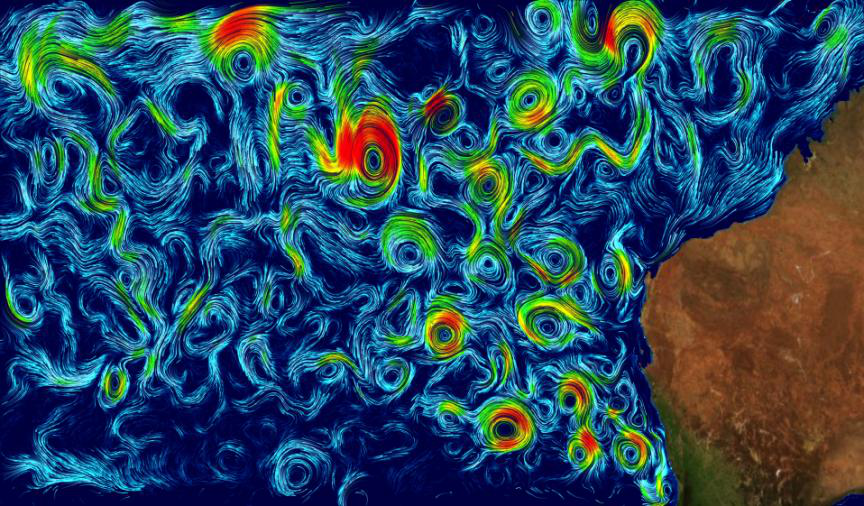 图片描述:本作品为通过科学可视化技术对全球海洋环流模拟局部数据进行可视化的结果,图片展示了分布于印度洋沃勒比和埃克斯茅斯深海高原附近的众多涡旋所组成的壮观画面,体现了大自然的奇妙恢弘之美。图片让人想到中国百年科学发展之路,犹如在波涛汹涌、暗流涌动的大海中航行探秘,每一朵浪花都是科技工作者孜孜不倦的追求,每一片涡旋都是科技工作者对自身科学领域的终级梦想,千万科技工作者的不懈努力换来中华民族前所未有的科学成就,众多的科学成果组成的绚烂拼图,成就了一代又一代科技工作者史诗般壮丽的中国梦,科技发展之梦。