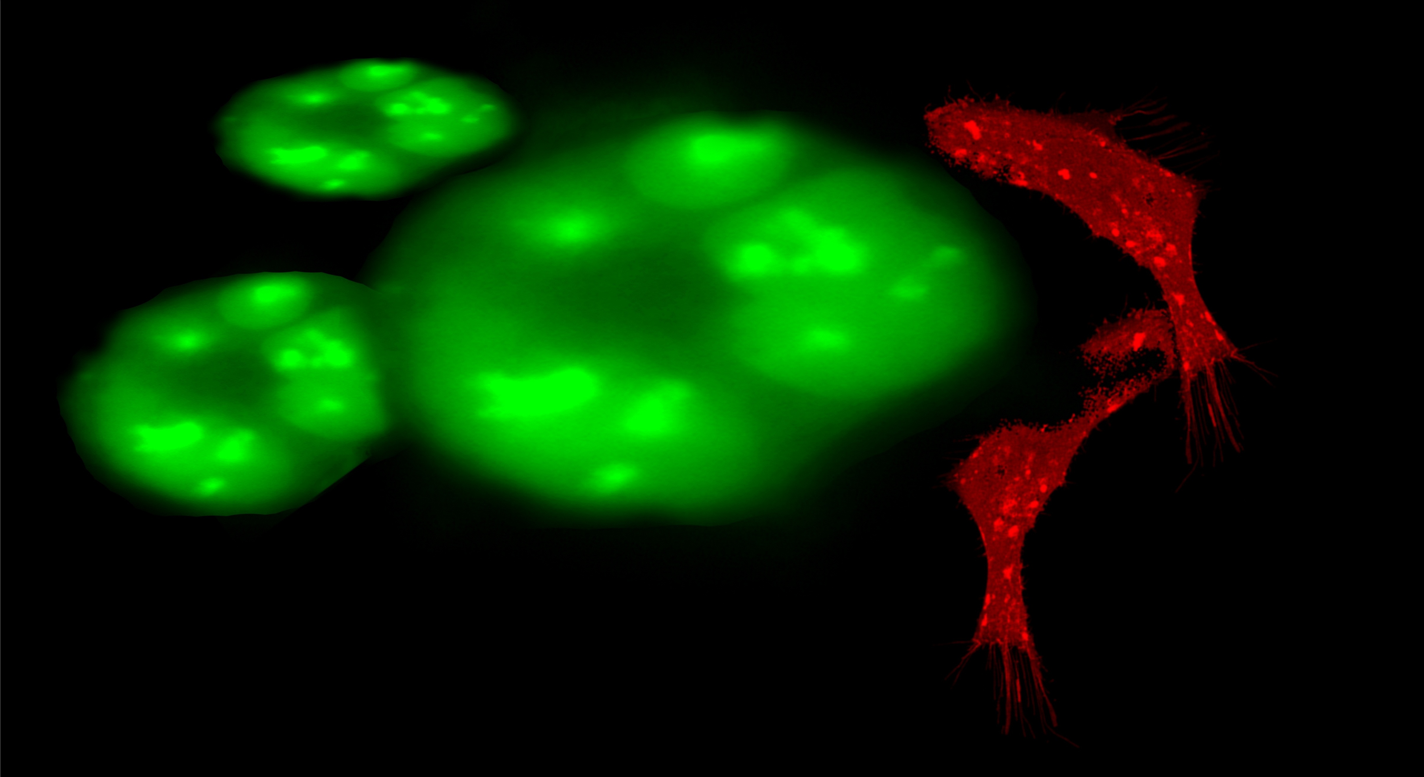 乐府诗《江南》中提到了“江南可采莲,莲叶何田田,鱼戏莲叶间”的美好景象,象征着鱼米之乡丰收盛况。作者使用实验室的激光共聚焦显微镜拍摄到的表达核内绿色荧光蛋白的细胞恰似这接天莲叶,而表达胞质红色荧光蛋白的细胞宛如一条条锦鲤跃然水面。希望以这幅作品祝福所里全体人员学习、工作、科研万事顺利!