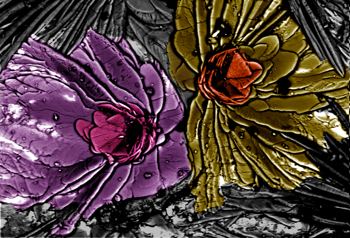 图片描述:本作品展示的是钢铁磷化膜的晶体状涂层结构。涂层从合金的活性点开始结晶并向外延展,最终覆盖住整个表面。向外生长的晶体仿若花瓣,而中心未能延展开的晶体则可比拟成花蕊。每一朵盛开的鲜花独立绽放时都很美艳,但是只有在它们彼此相连接后,才能实现对钢铁的腐蚀防护。