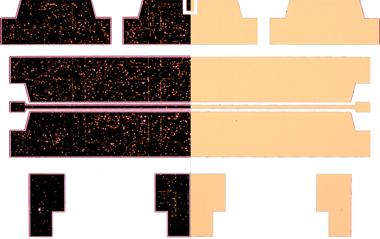 图片描述:本作品显示的是化合物半导体表面的金属传输线和布线的光学显微镜照片,由明场像和暗场像组成。右侧是明场像;左侧是对应区域暗场像的镜像,清晰的显示了明场像中无法看到的图形。作品整体表现为“鼎”的图案。右侧金黄色代表“问鼎”的荣誉和光鲜;左侧窗口内酷似高空俯视城市夜景,犹如凌晨的北京城。作品寓意为,在看得见的科研成绩背后,是看不见的无数个不眠的夜晚;只有经历过凌晨的北京,才能“问鼎”科技的高峰。