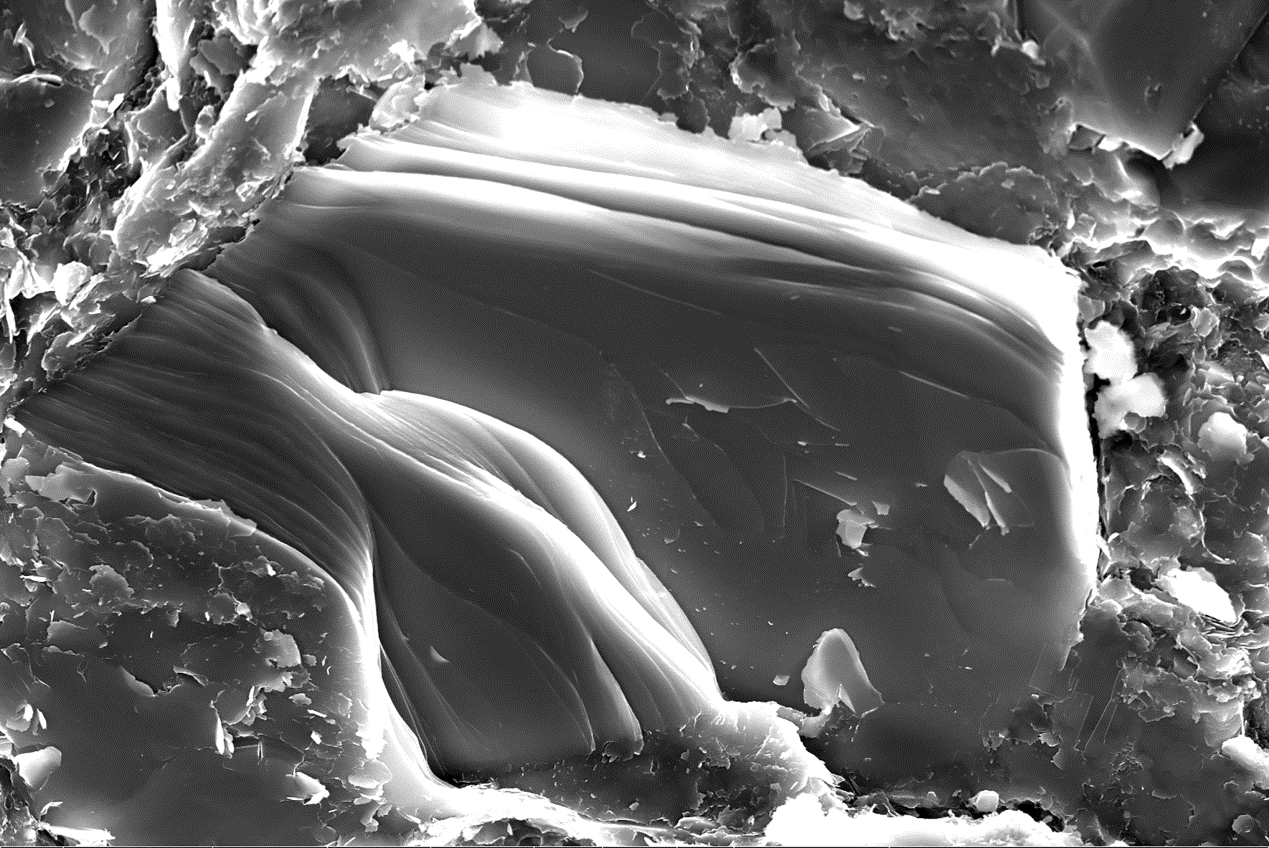 图片描述:本作品展示的是页岩微纳观尺度的拉伸断口形貌,揭露出页岩像书页一样的薄层状沉积结构,页岩层面的不均匀拉伸破裂形成了台阶状断口特征。该图片整体构图很像惊涛拍岸的景象,中间的层状页岩就像是海岸边的一块巨石,周围碎片式的粘土矿物就像浪花一样拍击和拥抱着巨石,页岩断口边缘光滑的弧线就像由水力冲蚀作用形成的侵蚀曲面,白色曝光部分就像烈日普照巨石的温暖的感觉。这幅图片给人一种“任尔惊涛拍岸,我自岿然不动”的豪迈感,表达了为我国地球科学研究和页岩气开发砥砺奋进的坚定信念。