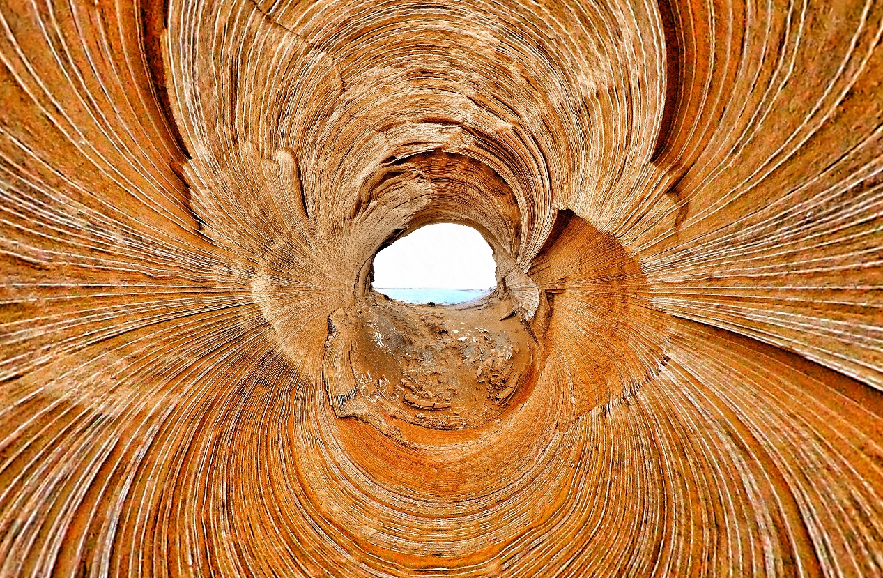 图片描述:本作品显示的是阿尔金无人区库木库里盆地“千层书”,可以看到这种非常独特的沉积岩构造。执行中科院青藏专项课题期间,赴阿尔金无人区进行野外考察,照片拍摄于新疆阿尔金国家级自然保护区百泉河上游,海拔4200米。“千层书”其实是产状水平、薄层状的砂岩与泥岩或页岩互层的沉积岩。实际拍摄了上下前后左右6张鱼眼镜头照片,软件合成为180*360度全景影像并调整投影角度后得到本作品。