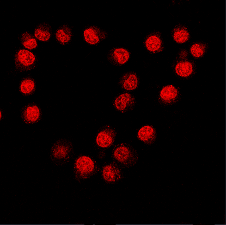 “爱心” 形状,纳米药物进入细胞核使核呈现红色荧光。