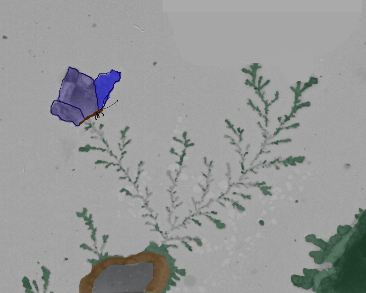 图片描述:这是谷胱甘肽晶体的TEM照片,延伸的晶体恰似生长在山石岩土上的植物枝丫,左侧成片的晶体则像是一只小憩良久,欲待起飞的蝴蝶。气韵生动,应物象形,恰似一幅淋漓的写意水墨画。