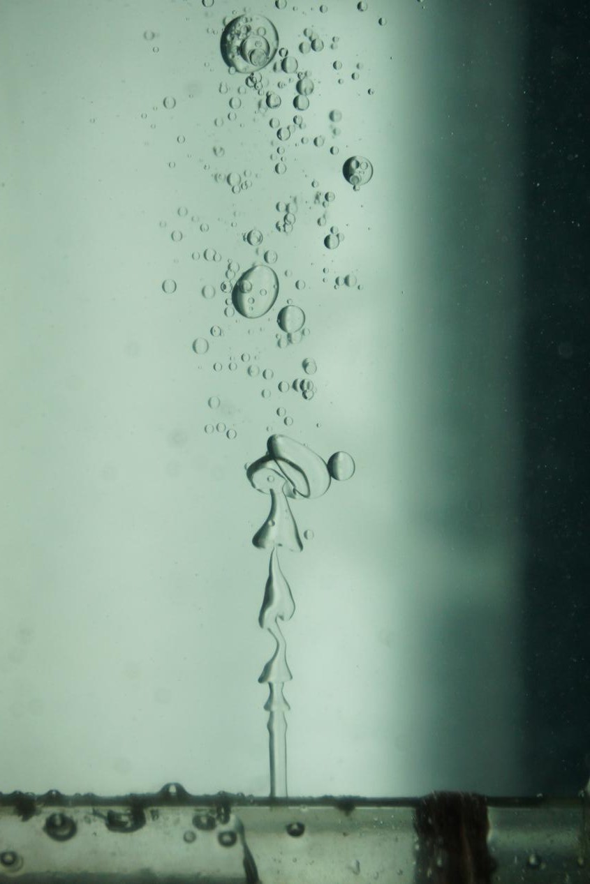 此图捕捉了水中的油射流发生高地射线长度不稳定(Plateau–Rayleigh instability)前的某个瞬间。它从空间上完美地诠释了“发展”一词的含义,油相从出口处径向尺寸变化不大的油柱,上升过程中出现膨大段和颈缩段的交替变化;随着颈缩段的变细,上部的油相和整体油柱“藕断丝连”,直至发生大变形,破碎成油滴。这说明任何的果都是前期一环扣一环的因的基础上来的,所以说“罗马不是一天建成的”,做事不应只盯着或者想着结果,更应关注事物循序渐进的发展过程。