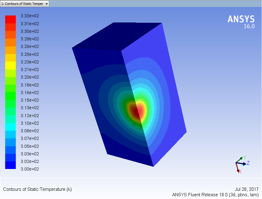 计算方法: 通过fluent计算软件中的UDF模块自定义一个激光热源,施加在左侧表面中心。然后定义合理的边界条件,迭代100次计算收敛得到。