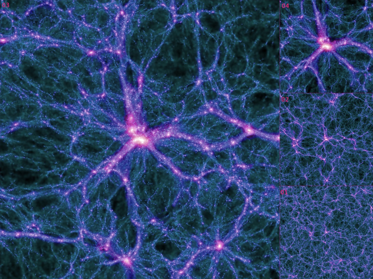 图片描述:本作品显示的是“盘古计划”数值模拟最后一个时刻的宇宙结构,它显示的是宇宙由混沌之处,经过暗物质引导的相互作用形成的相对稳定的宇宙结构。图片由4幅图像拼接而成,4幅图像分别是不同尺度下的宇宙结构,图片编号01-04分别对应尺度600MPC/H、300MPC/H、150MPC/H、75MPC/H。图中亮度代表物质分布,颜色代表能量分布,其中亮点是星系,更亮的成团亮点是星系团。