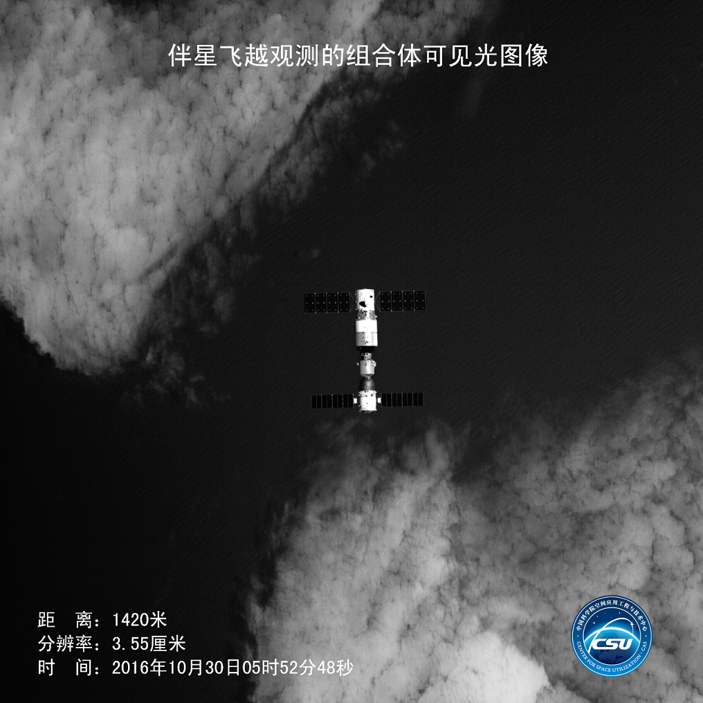 图片描述:本作品显示的是“天宫二号”空间实验室与“神舟十一号”载人飞船交会对接后“组合体”飞行的画面。这副画面是由“天宫二号”的自拍神器——一颗伴随“组合体”飞行的小卫星拍摄而成,拍摄此图片时刻,伴星距离“组合体”1420米,分辨率为3.55厘米。图片中能清晰地看到组合体及其太阳能帆板,甚至可以看到组合体外部的载荷轮廓。图片背景中黑色的部分为海水,白色的部分是云层。为了使我们太空中的自拍器成像色彩更鲜艳,更清晰,我们科研人员定当砥砺向前。