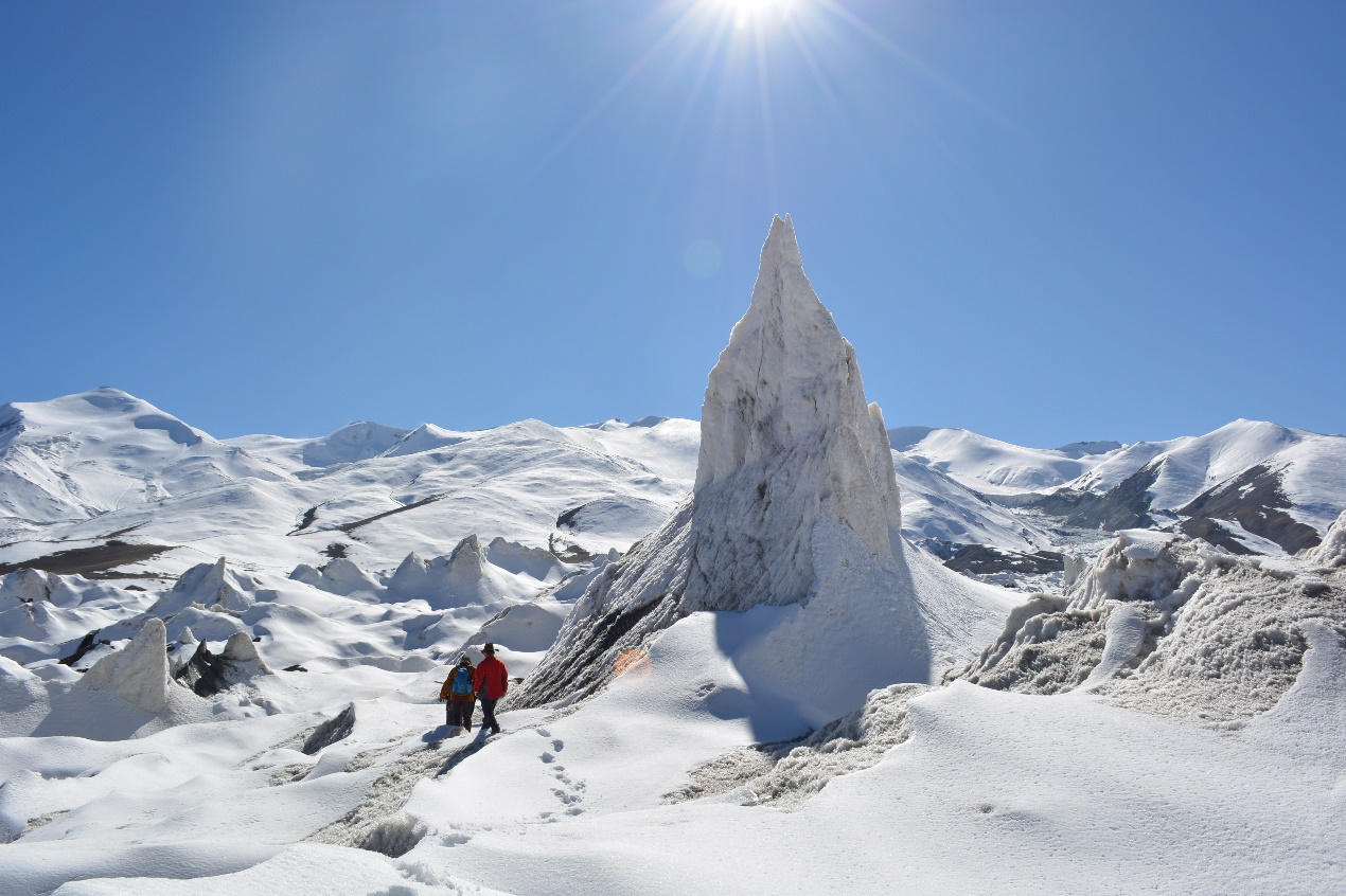 此图为姚院士行进在冰崩过后危险重重的冰山之下。