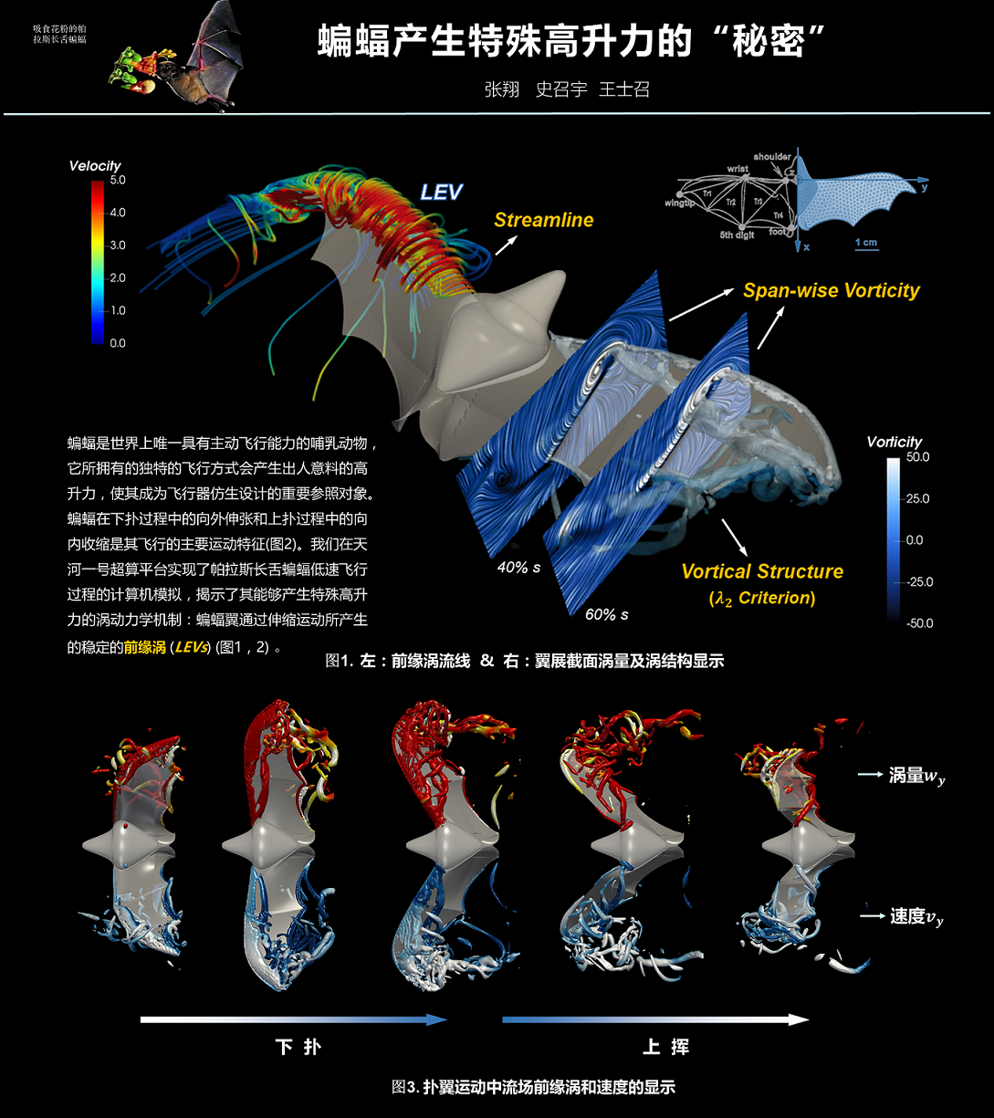 蝙蝠是世界上唯一能够飞行的哺乳动物,其高效而独特的飞行方式是微型飞行器仿生设计和制造所看重的特点,如何准确捕捉其飞行中的特征流场结构并分析其对飞行性能的影响是本作品要展示的内容。这副可视化作品是利用并行超算实现的帕拉斯长舌蝙蝠低速飞行的数值模拟,通过控制翼展的伸缩运动(上挥和下扑)过程,发现蝙蝠其独特的扑翼运动会产生并提高前缘涡的强度,揭示了蝙蝠拥有的特殊高升力的原因,为仿蝙蝠微型飞行器的设计提供了理论基础。在对数据可视化的过程中,我们体会到对于一个物理问题,能够很好地将复杂的数据转化为一种易于解读的形式比如图片或动画,对于整个物理现象的描述和理解具有重要作用。
