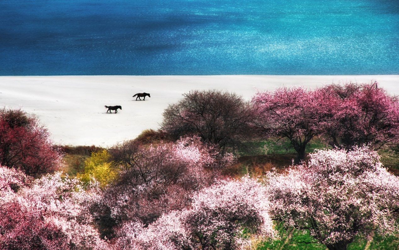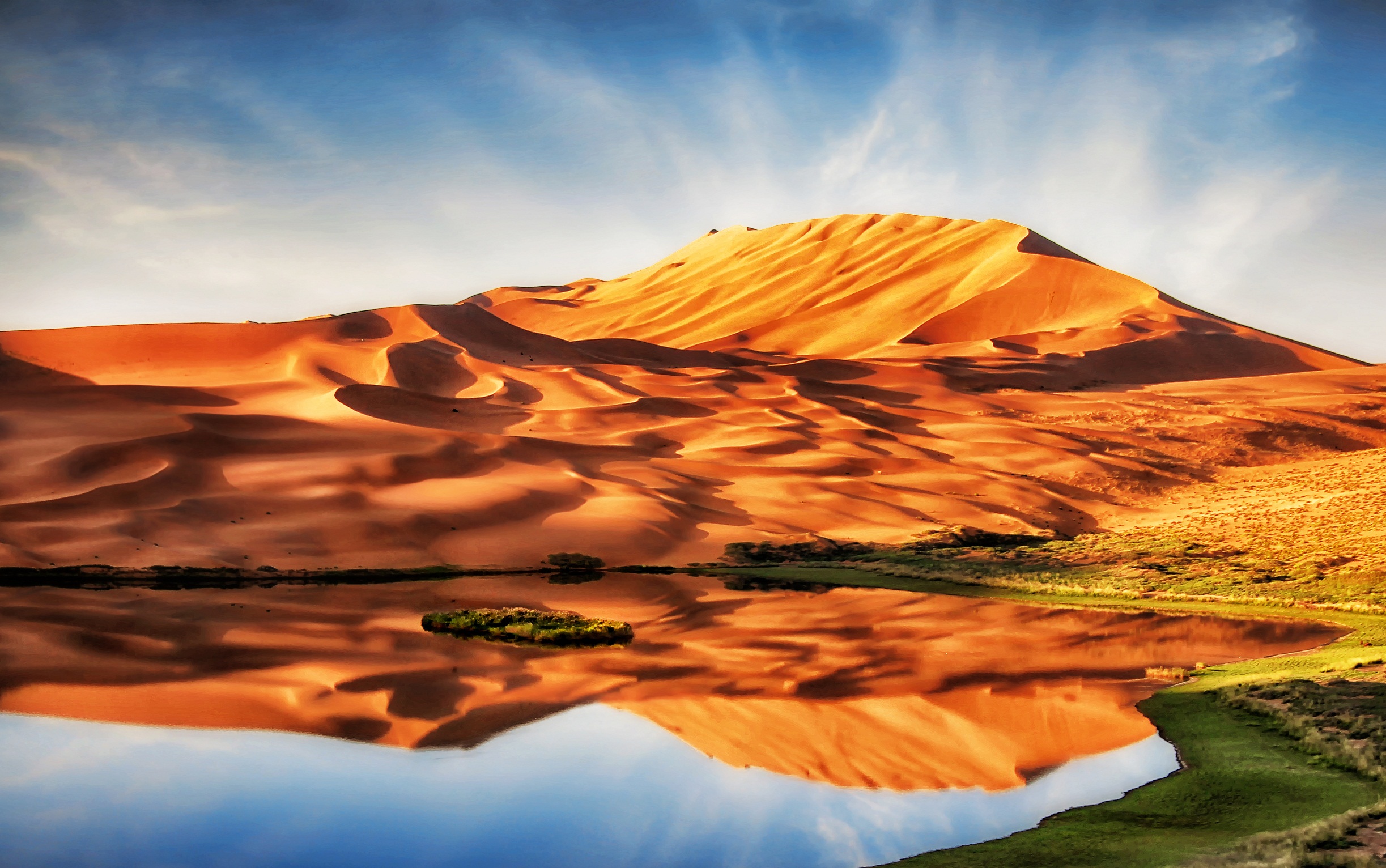 图片描述:在内蒙古阿拉善右旗的巴丹吉林沙漠中上演了最为突破脑洞的自然景观组合——沙漠与湖泊相映成趣。在这里浩瀚的沙山间竟然分布着一百多个碧玉般的湖泊,有淡水湖泊也有咸水湖泊。根据专家研究发现,这些沙中海子中的水来源于是远在五百公里外的祁连山,雪山融水通过地下深处的阿尔金断裂带源源不断地进入沙漠。通过一些海子底部生成的钙华物质可以佐证深层循环水的存在。此外,巴丹吉林沙漠拥有全世界平均高度最高的沙山群。