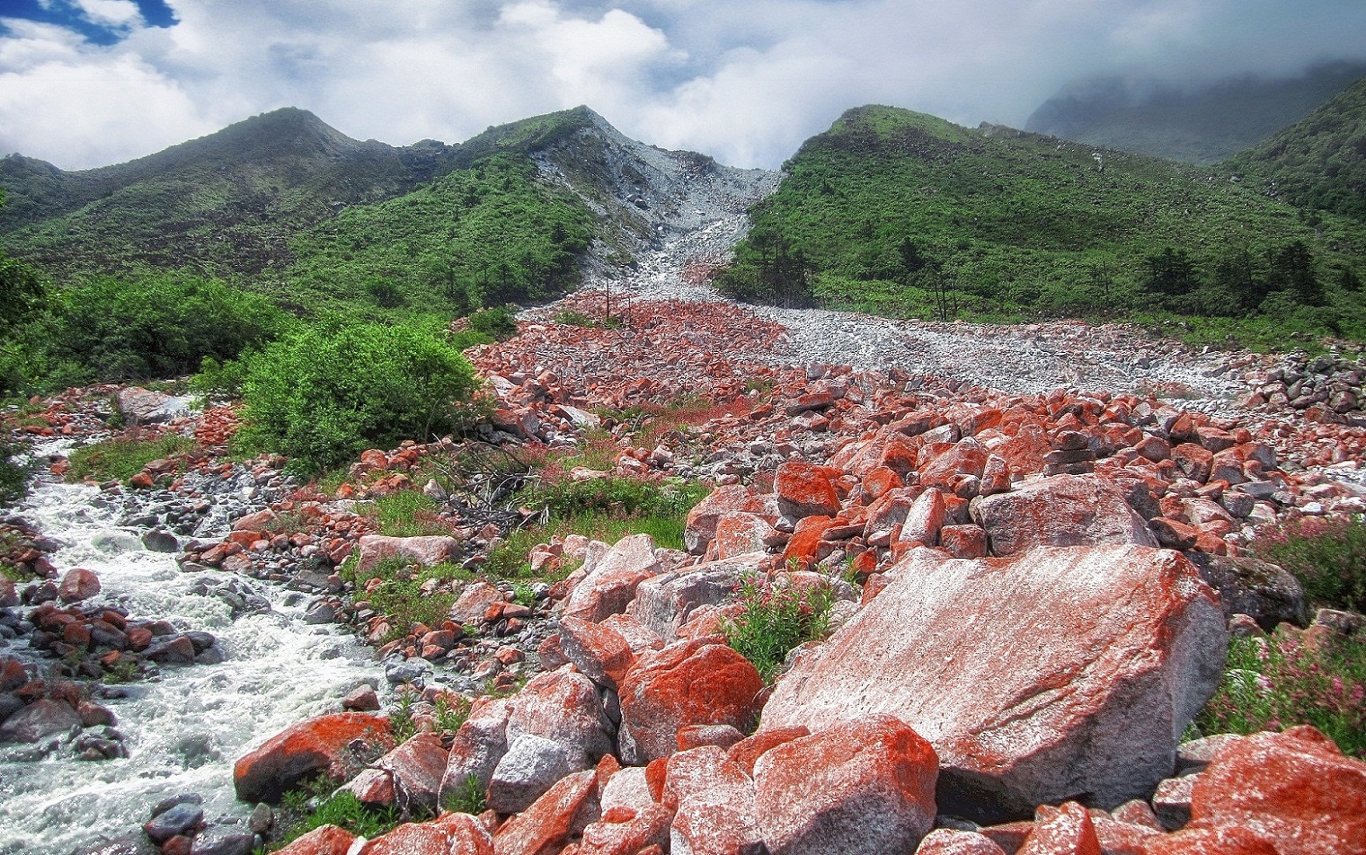图片描述:四川贡嘎山东坡处于青藏高原的边缘地带,这里广泛分布着海洋型冰川。由于海洋型冰川流动速度很快,因此两侧山谷崩塌滑坡产生的冰碛物(石块和泥沙)会被运送并堆积起来,之后遇到洪水或是泥石流就被带到山坡山谷地带。泥石流的冲击往往会破坏原先岩石之上的生物群落,使得约利橘色藻这种与其他藻类、地衣植物不兼容生存的物种有了开拓自身群落的机会。贡嘎山东坡和海洋性冰川的密集、周期性的水石型泥石流,再加上适宜的温度、湿度、光照,使得红石滩景观在这一地区密集、成规模的出现,形成川西地区的一道独特的风景线。
