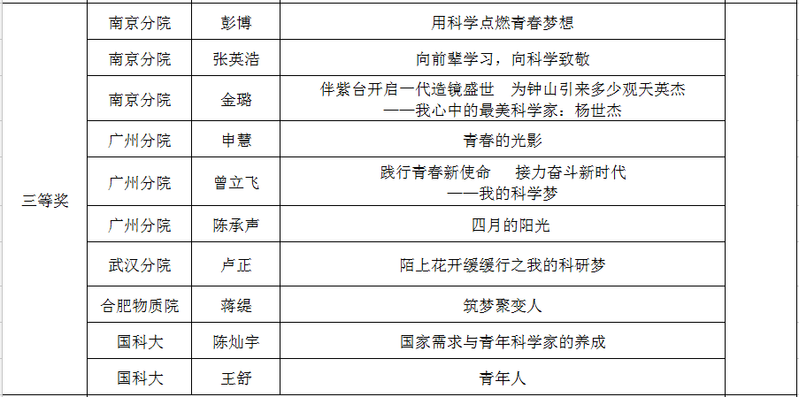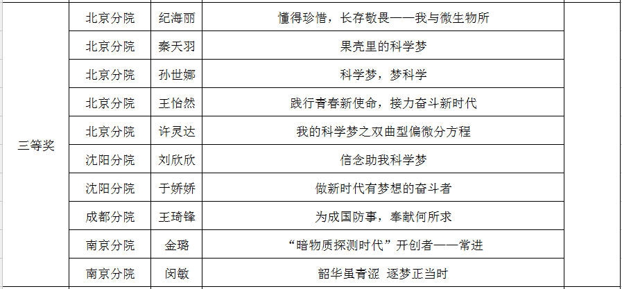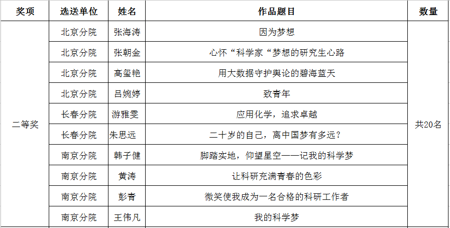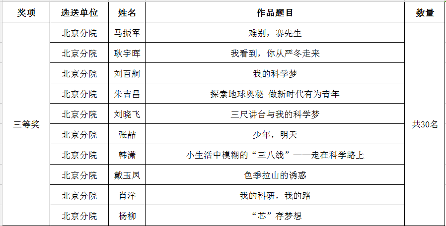 经评审专家委员会评审,《与信念为伴,携创新同行,实现我的科学梦》等10篇作品获得一等奖;《因为梦想》等20篇作品获得二等奖,《难别,赛先生》等30篇作品获得三等奖。