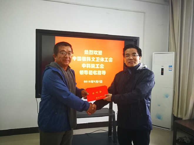 刘京红代表直属机关党委、中科院工会向联合科研基地职工表示慰问,并代表院工会向基地赠送了慰问品和慰问金。