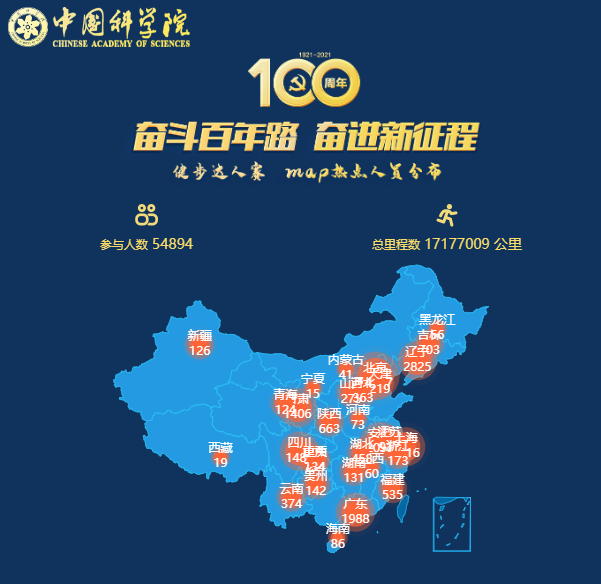为庆祝中国共产党成立100周年,中科院工会、体协结合党史学习教育,聚焦职工健康期盼,在全院范围内举办了“奋斗百年路奋进新征程”线上健步达人赛。活动始于3月23日,止于6月30日,历时100天,线上参赛近5.5万人,覆盖全国31个省区市,总里程达1700余万公里,活动规模创造了中科院全民健身单项活动的历史纪录。