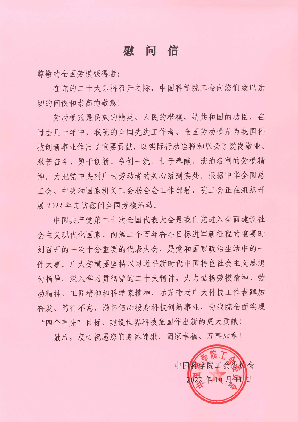 为迎接党的二十大胜利召开,把党中央对广大劳动者的关心落到实处,10月13日,中国科学院党组成员、副秘书长、院工会主席李和风走访慰问了中国科学院原院长白春礼院士,国家最高科学技术奖获得者、大气物理研究所曾庆存院士,数学与系统科学研究院杨乐院士等3位全国劳模。