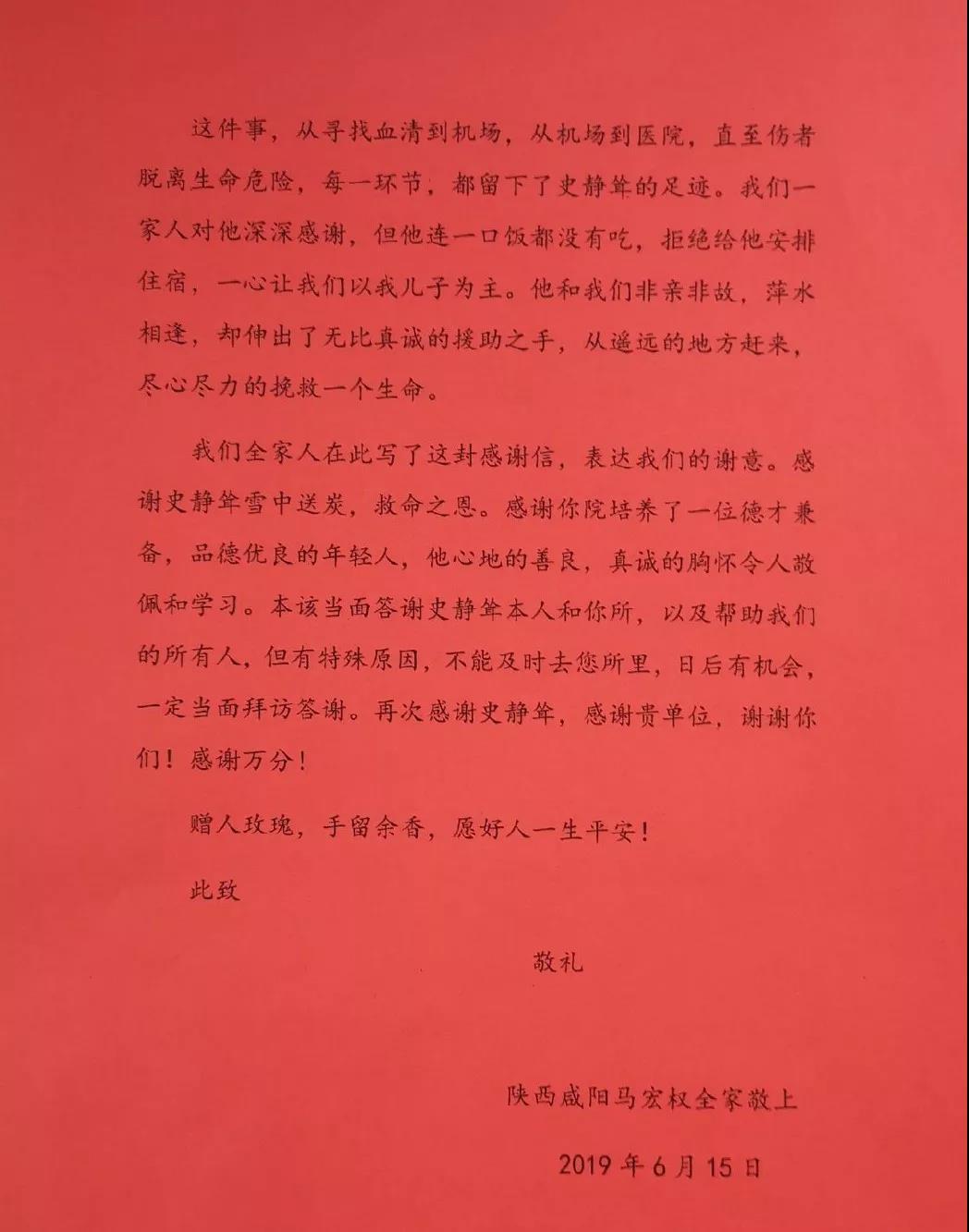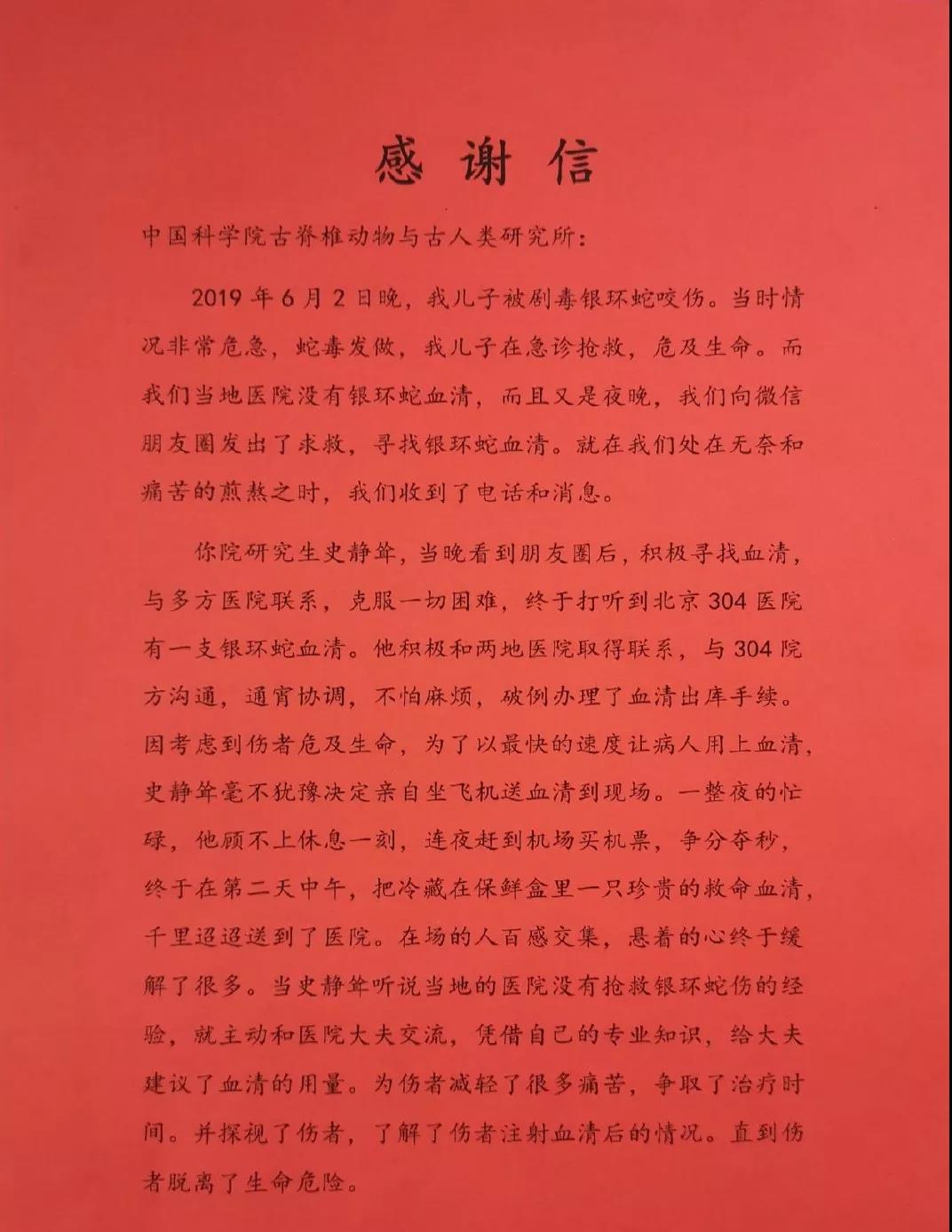 6月25日下午,中国科学院古脊椎动物与古人类研究所党群宣传处收到了一封来自陕西咸阳一对夫妇发来的感谢信及一面锦旗。信中感谢所里博士生史静耸救助自己被剧毒蛇咬伤的儿子。