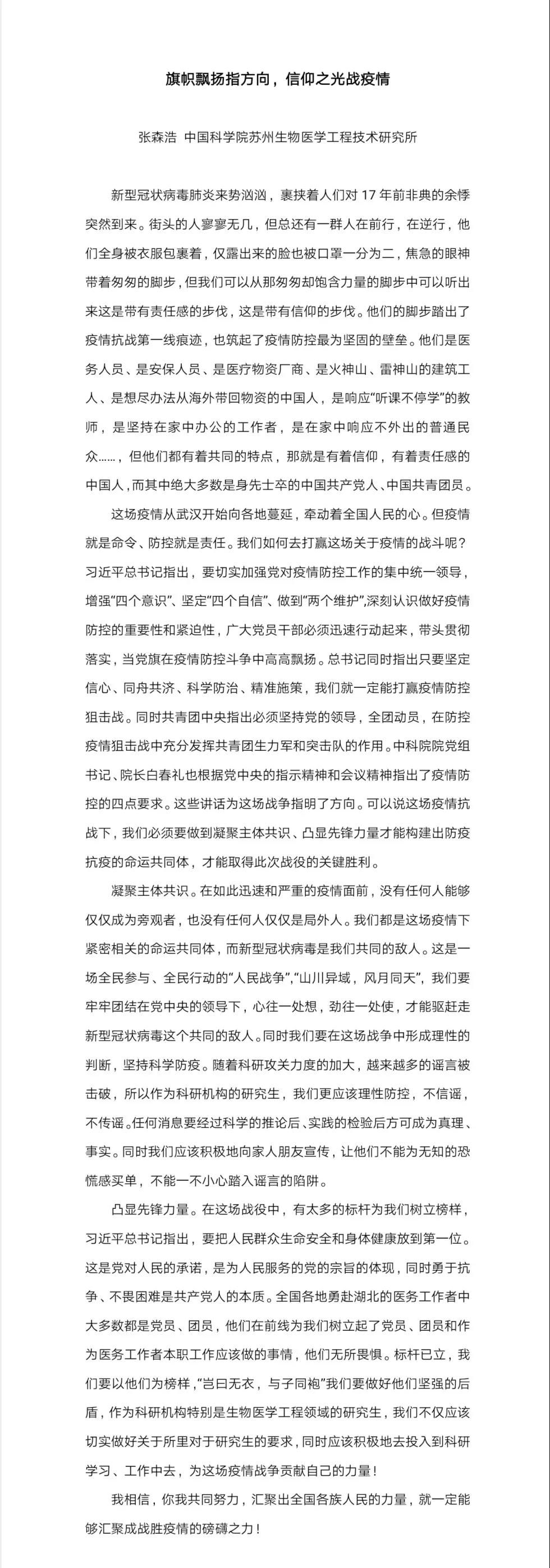 全国各地勇赴湖北的医务工作者中大多数都是党员、团员,他们在前线为我们树立起了党员、团员和作为医务工作者本职工作应该做的事情,他们无所畏惧。标杆已立,我们要以他们为榜样,“岂曰无衣,与子同袍”我们要做好他们坚强的后盾,作为科研机构特别是生物医学工程领域的研究生,我们不仅应该切实做好关于所里对于研究生的要求,同时应该积极地去投入到科研学习、工作中去,为这场疫情战争贡献自己的力量!我相信,你我共同努力,汇聚出全国各族人民的力量,就一定能够汇聚成战胜疫情的磅礴之力!(张森浩)