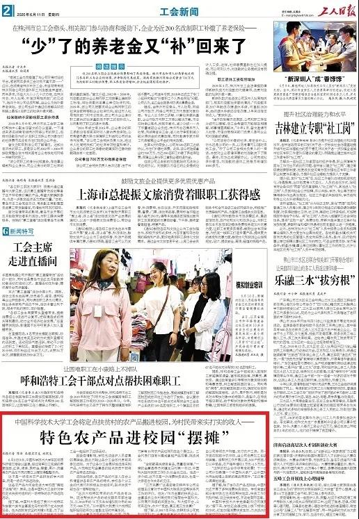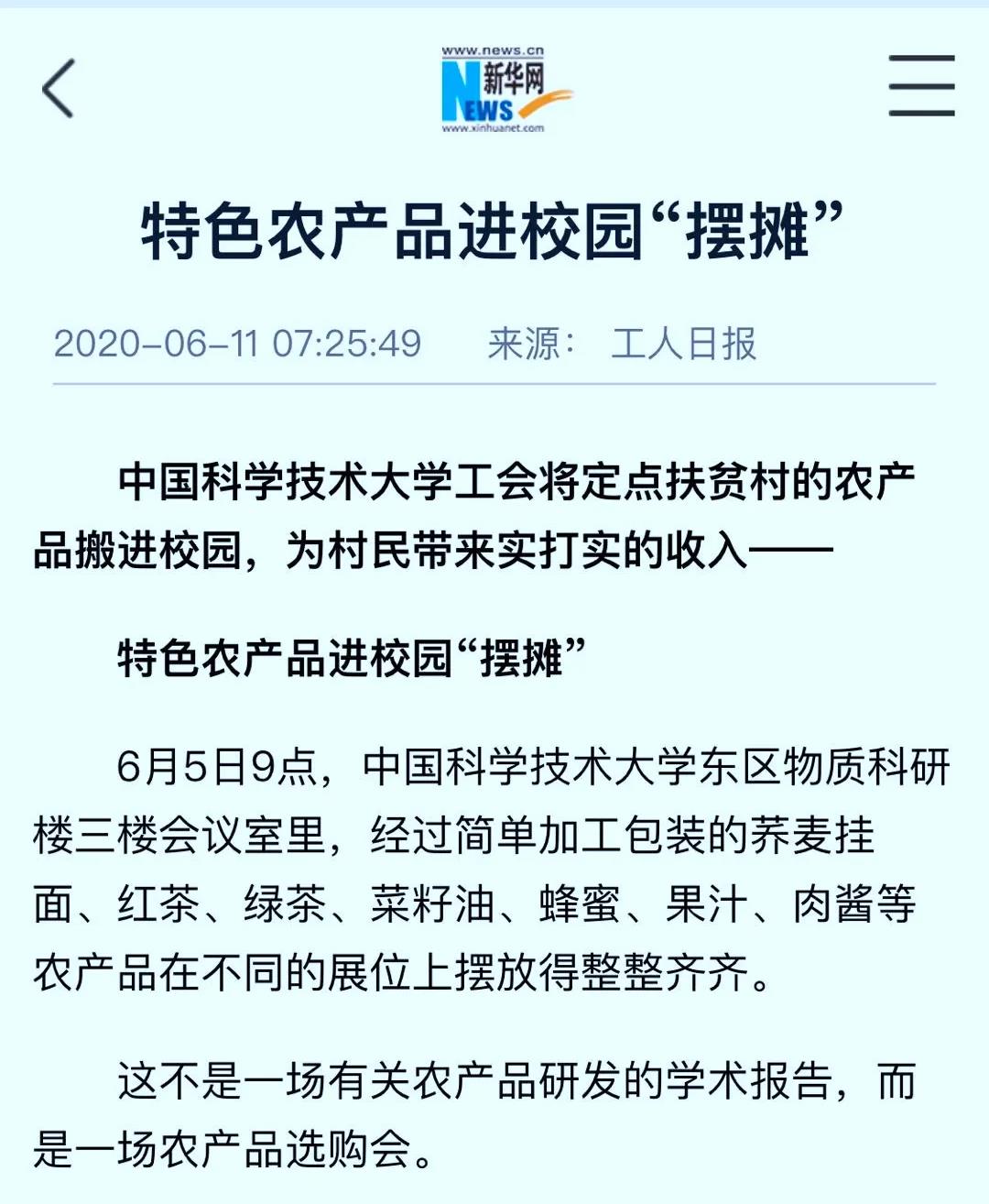 6月11日,《工人日报》刊发了《特色农产品进校园“摆摊”》一文,聚焦中国科学技术大开展农产品消费扶贫选购会帮扶系列工作。