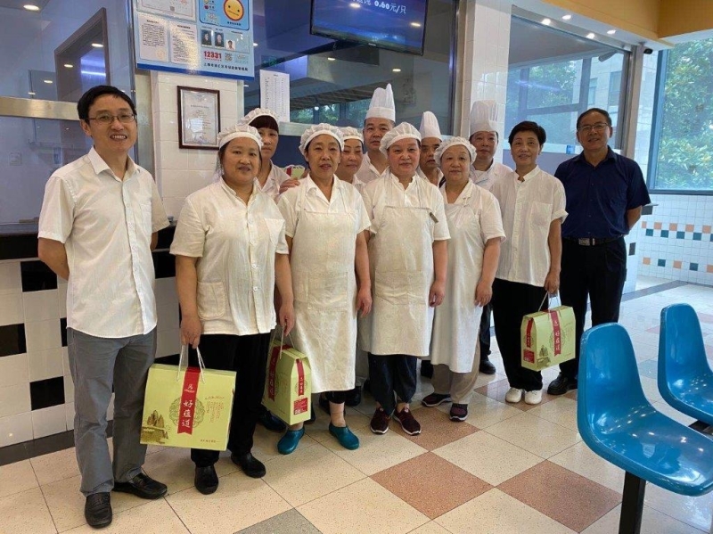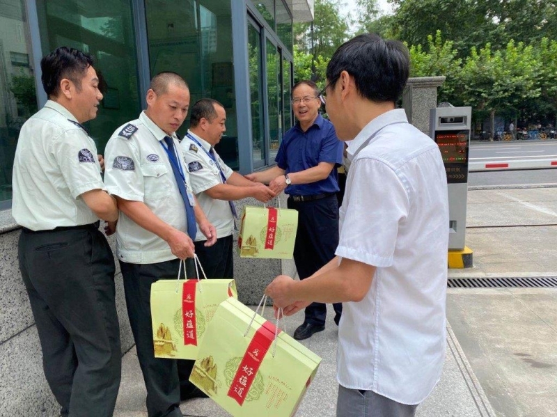 8月6日上午,陶隽和汪显坤等,慰问了徐家汇园区中工作在高温岗位的维修保障、保安保洁、食堂等后勤保障人员。