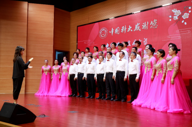 荣休典礼在教职工合唱团合唱《我的中国心》《红莓花儿开》中开始。