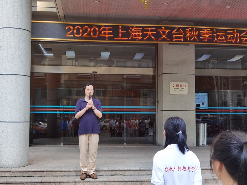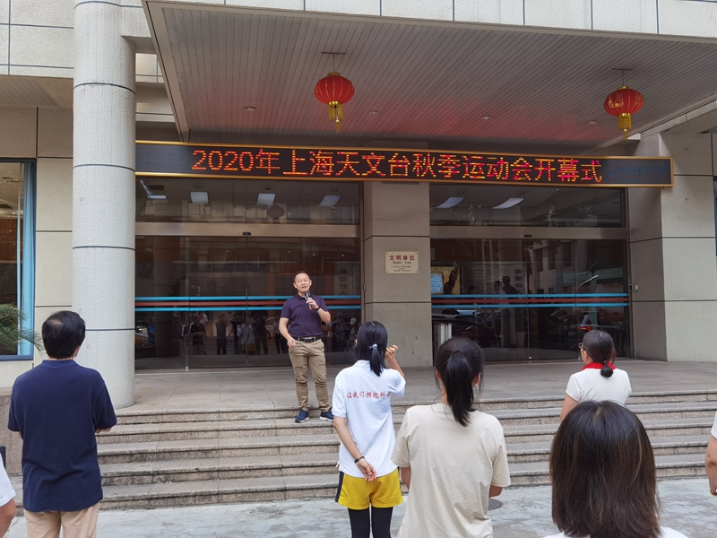2020年9月9日上午,上海天文台2020年秋季运动会暨首届女子运动会开幕式在我台徐家汇园区举行。开幕式由工会主席汪显坤主持,台长沈志强、党委书记侯金良、党委副书记副台长陶隽参加了开幕式。侯金良书记代表台领导班子讲话希望大家通过运动会赛出水平、赛出友谊、赛出风格、赛出上海天文台人的精神风貌,并预祝本次运动会取得圆满成功。