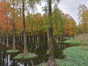 下午,大家游览了网红打卡点:水上森林。这是一片种植了30多年的杉树林。秋意正浓,有的杉树还是绿色,有的已经变黄,阳光充足的地方杉树叶已经变成了红色。远远地看去五彩缤纷,层次鲜明,错落有致,再加上水中的倒影,美不胜收。随手一拍,不用调色,张张都是大片!