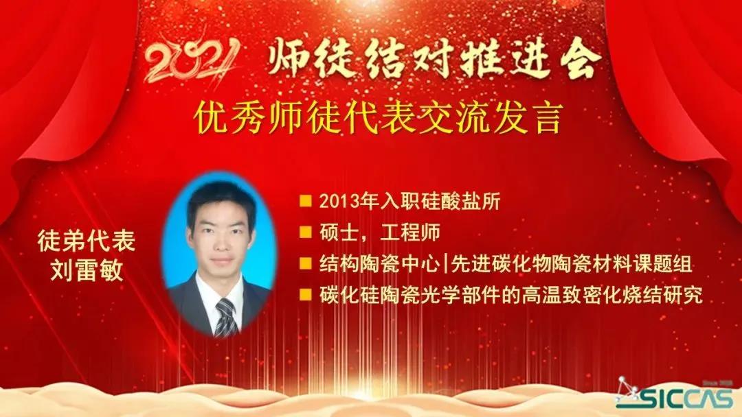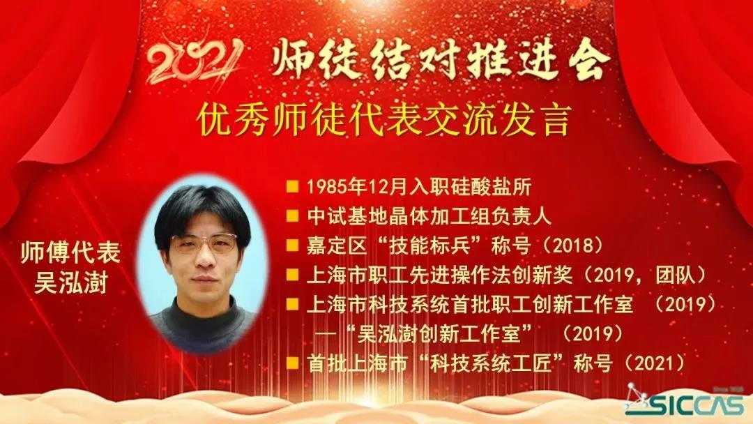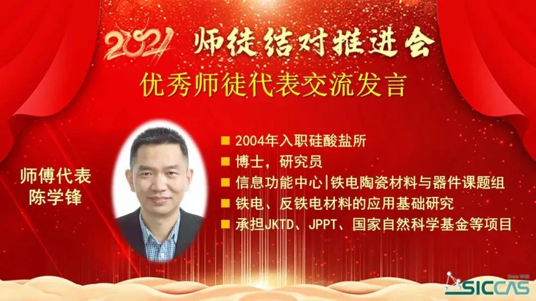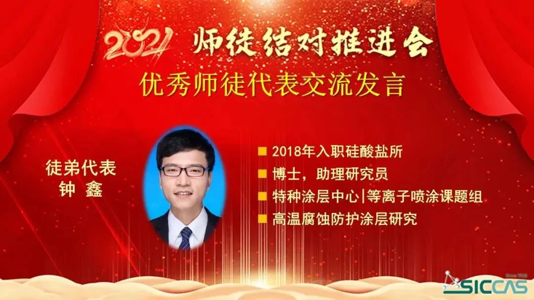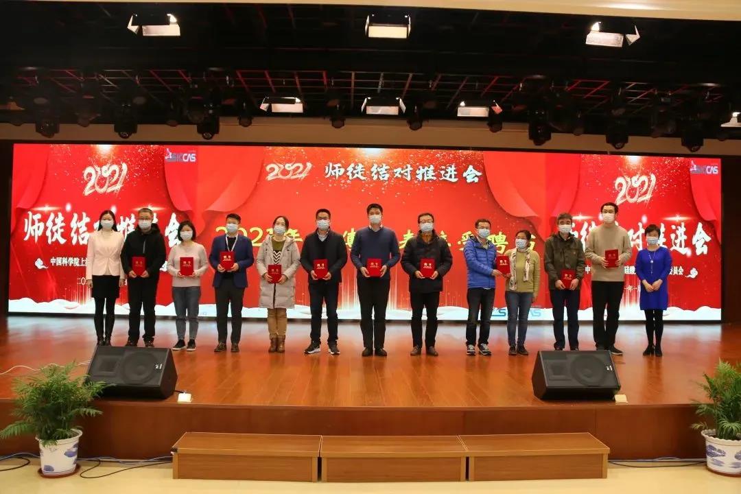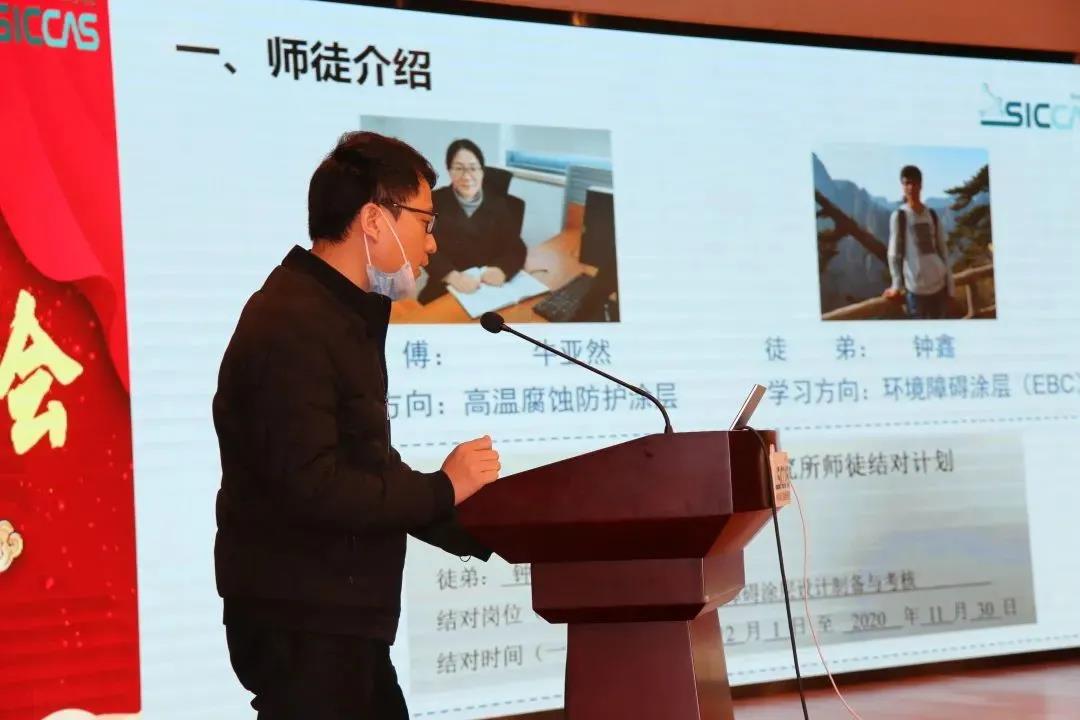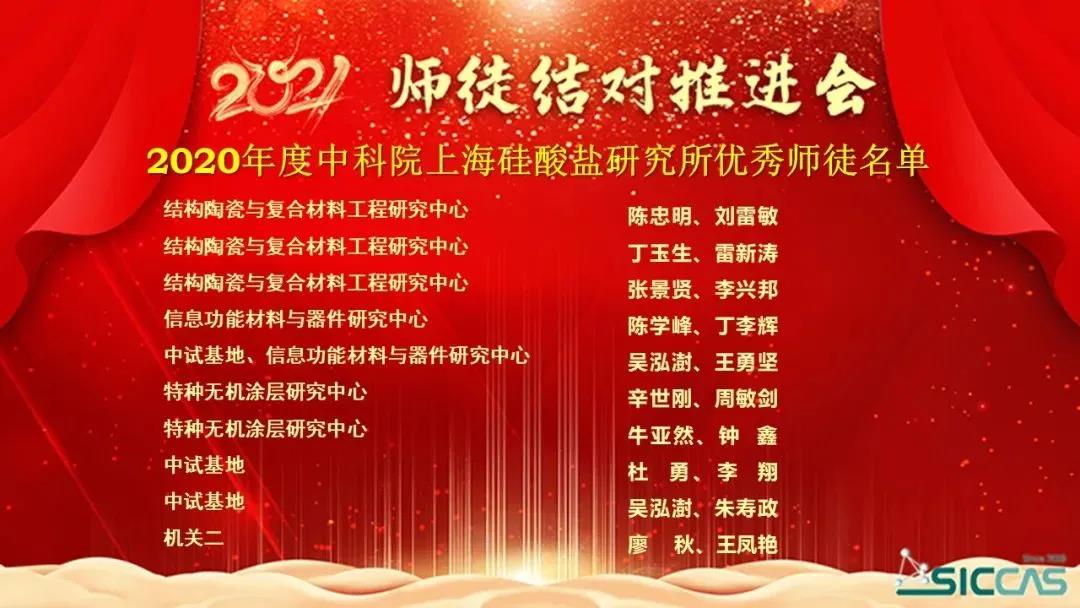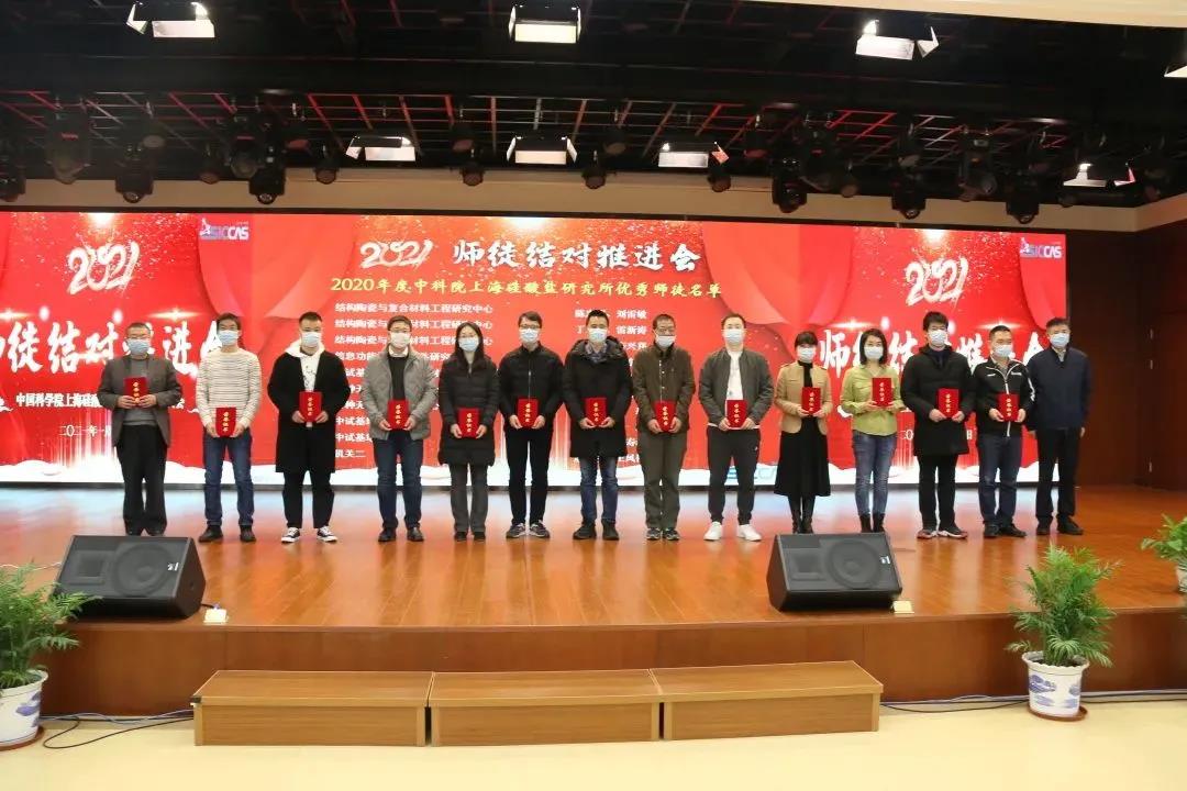 会上,表彰了2020年度优秀师徒。姚秀敏宣读了《所工会委员会关于表彰2020年度中国科学院上海硅酸盐研究所优秀师徒的决定》。在不平凡的2020年里,32对师徒用爱心、用深情、用协同创新力写下了师徒结对新篇章,生动践行师傅“传师魂传师能传师德”、徒弟“学情怀学本领学做人”的“三传三学”的活动宗旨,涌现了陈忠明、刘雷敏等10对优秀师徒。在欢快的乐曲声中,杨建华为10对优秀师徒颁发了奖状。