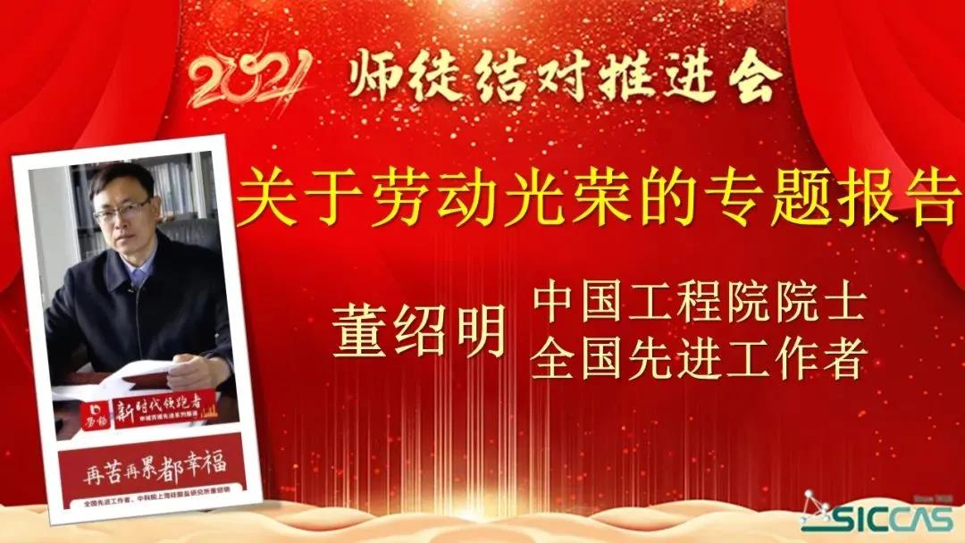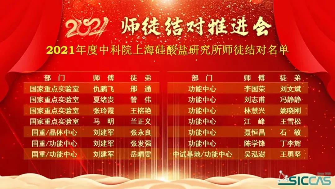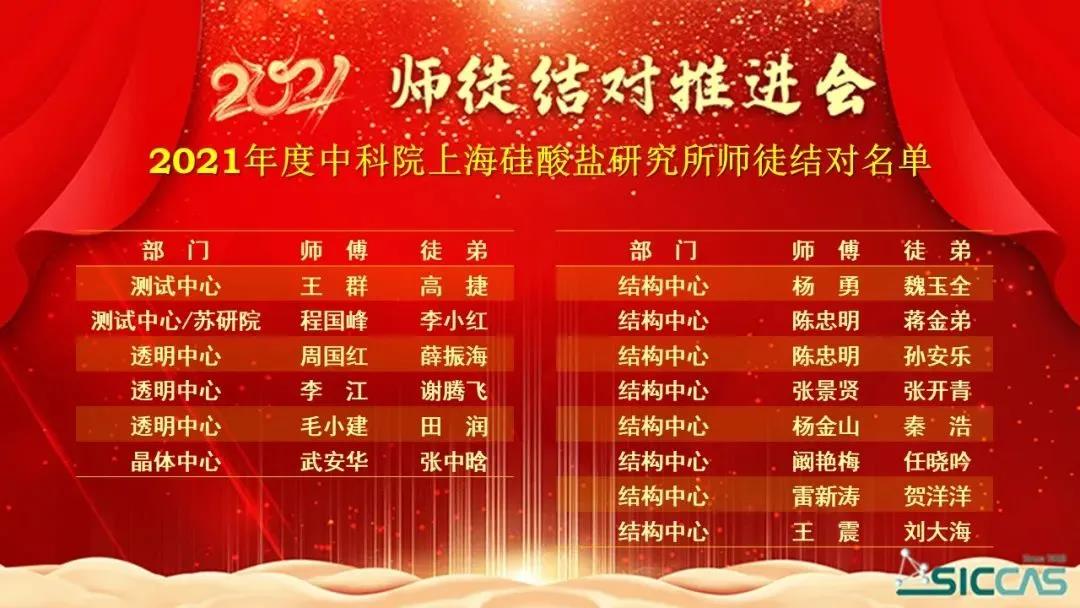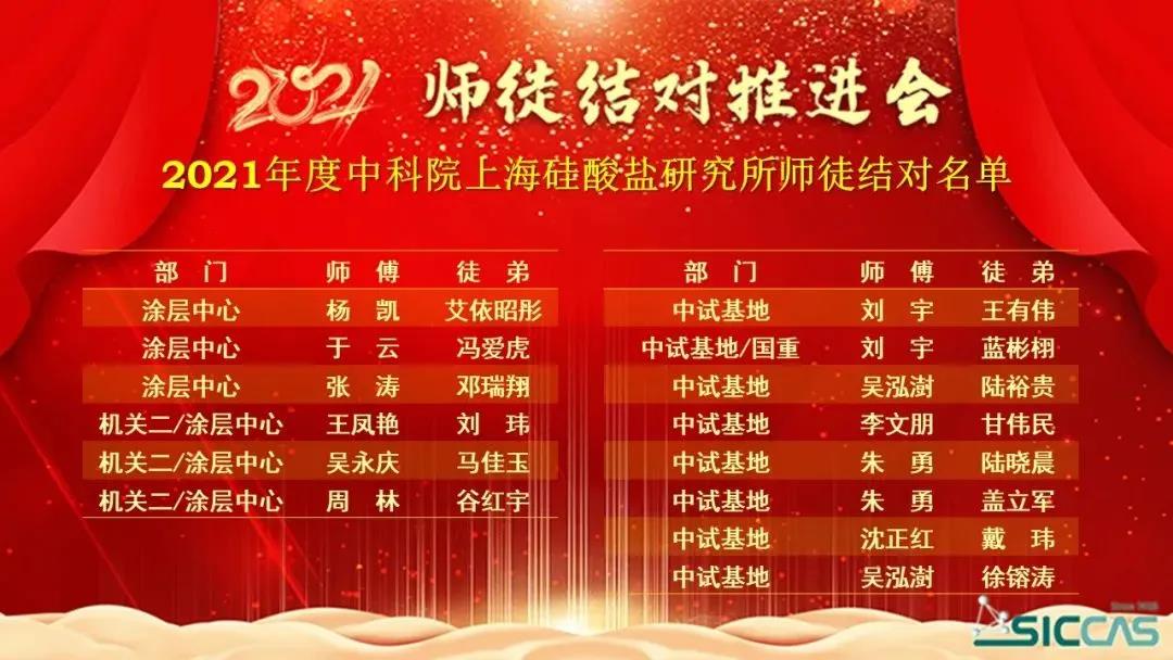 1月22日,中国科学院上海硅酸盐研究所工会委员会举行2021年师徒结对推进会。所党委副书记、纪委书记杨建华,全国先进工作者、中国工程院院士、所学术委员会主任董绍明,所党委委员、综合办公室主任彭芳以及各党支部书记和师徒结对的各位老师等参加了会议。会议由所工会委员曾华荣主持,设主会场和视频分会场。