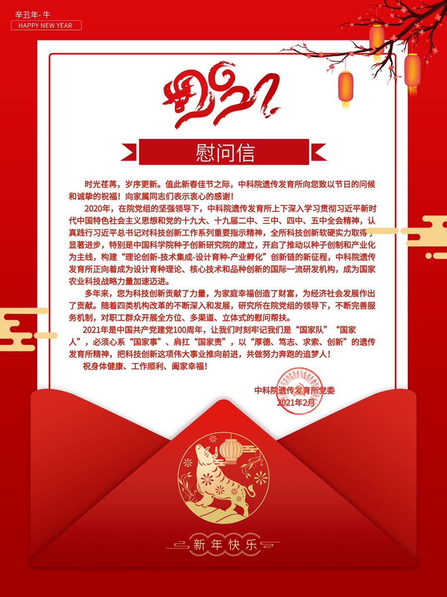 每一封慰问信、每一份慰问红包、每一个慰问电话、每一份防疫物资都承载着研究所的关怀、祝福和感谢。2020年,在院党组的坚强领导下,中科院遗传发育所上下深入学习贯彻习近平新时代中国特色社会主义思想和党的十九大、十九届二中、三中、四中、五中全会精神,认真践行习近平总书记对科技创新工作系列重要指示精神,全所科技创新软硬实力取得了显著进步,特别是中国科学院种子创新研究院的建立,开启了推动以种子创制和产业化为主线,构建“理论创新-技术集成-设计育种-产业孵化”创新链的新征程,中科院遗传发育所正向着成为设计育种理论、核心技术和品种创新的国际一流研发机构,成为国家农业科技战略力量加速迈进。