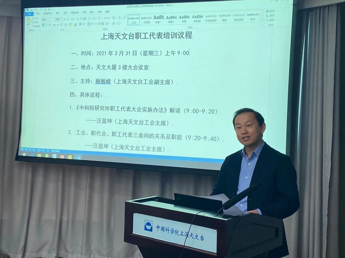 为进一步提高职工代表履职能力和民主管理的水平,加强职工代表对自身权利和义务的了解,增强职工代表提案的撰写能力,2021年3月31日,上海天文台工会组织开展职工代表培训,40余名职工代表参加了培训。培训会议由工会副主席顾敏峰主持,台领导侯金良、陶隽、姚娅平参加了会议。