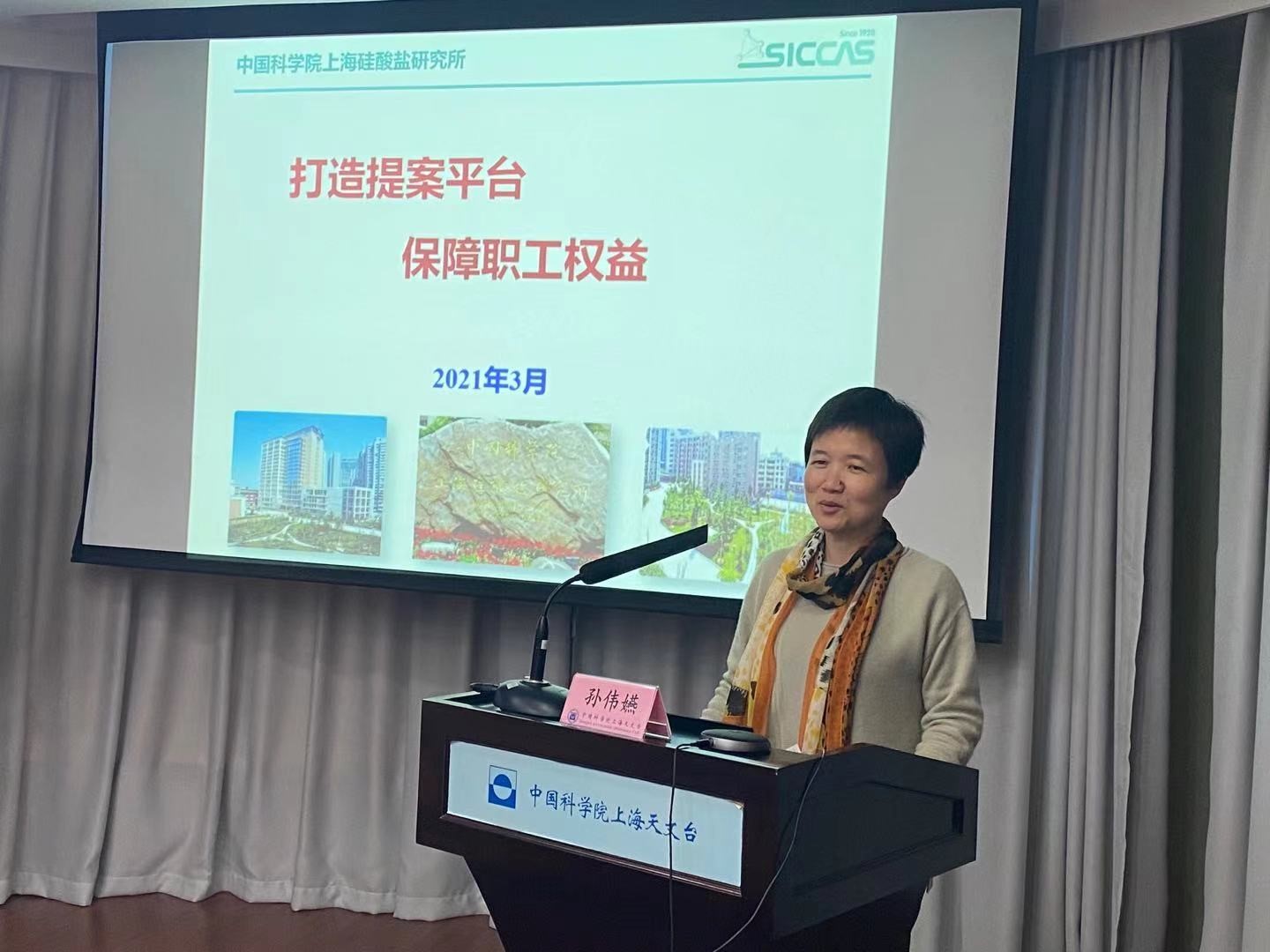 中科院上海分院工会副主席、上海硅酸盐研究所工会主席孙伟嬿应邀来台给职工代表带来《打造提案平台,保障职工权益》的主题报告。孙伟嬿解释了提案的基本涵义,介绍了不合格提案的评审标准、提案聚焦的重点,并从提案内容规范、提案质量提高、提案执行反馈机制完善等方面,回顾了上海硅酸盐研究所提案发展的过程。孙伟嬿还与参会人员分享了优秀提案范例,分享了怎样写好提案的心得体会。