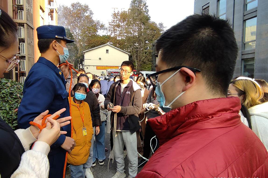 吴兴消防支队周南副站长为大家讲解了消防车配备的消防设备(钢梯、水枪、便携式灭火器、自持式呼吸器、防护服、破拆工具、急救工具等装备)的基本工作原理和使用常识,随后介绍了干粉灭火器和二氧化碳灭火器的正确使用方法和注意事项。参训师生对模拟起火点进行了灭火演习,消防员从旁指导如何使用器材,同时保护自己,大家都表示切实的演练与想象还是有很大的差距,切身体会到了火灾的危险力量。现场还设置了正压空气呼吸器体验演示,让大家感受消防工作的实战状态。逃生绳结演示吸引了不少喜欢动手的人员,大家表示,“有用”的知识又增加了。